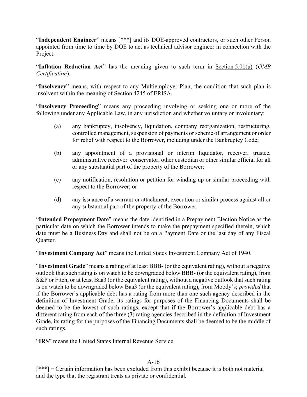 A-16 [***] = Certain information has been excluded from this exhibit because it is both not material and the type that the registrant treats as private or confidential. “Independent Engineer” means [***] and its DOE-approved contractors, or such other Person appointed from time to time by DOE to act as technical advisor engineer in connection with the Project. “Inflation Reduction Act” has the meaning given to such term in Section 5.01(u) (OMB Certification). “Insolvency” means, with respect to any Multiemployer Plan, the condition that such plan is insolvent within the meaning of Section 4245 of ERISA. “Insolvency Proceeding” means any proceeding involving or seeking one or more of the following under any Applicable Law, in any jurisdiction and whether voluntary or involuntary: (a) any bankruptcy, insolvency, liquidation, company reorganization, restructuring, controlled management, suspension of payments or scheme of arrangement or order for relief with respect to the Borrower, including under the Bankruptcy Code; (b) any appointment of a provisional or interim liquidator, receiver, trustee, administrative receiver. conservator, other custodian or other similar official for all or any substantial part of the property of the Borrower; (c) any notification, resolution or petition for winding up or similar proceeding with respect to the Borrower; or (d) any issuance of a warrant or attachment, execution or similar process against all or any substantial part of the property of the Borrower. “Intended Prepayment Date” means the date identified in a Prepayment Election Notice as the particular date on which the Borrower intends to make the prepayment specified therein, which date must be a Business Day and shall not be on a Payment Date or the last day of any Fiscal Quarter. “Investment Company Act” means the United States Investment Company Act of 1940. “Investment Grade” means a rating of at least BBB- (or the equivalent rating), without a negative outlook that such rating is on watch to be downgraded below BBB- (or the equivalent rating), from S&P or Fitch, or at least Baa3 (or the equivalent rating), without a negative outlook that such rating is on watch to be downgraded below Baa3 (or the equivalent rating), from Moody’s; provided that if the Borrower’s applicable debt has a rating from more than one such agency described in the definition of Investment Grade, its ratings for purposes of the Financing Documents shall be deemed to be the lowest of such ratings, except that if the Borrower’s applicable debt has a different rating from each of the three (3) rating agencies described in the definition of Investment Grade, its rating for the purposes of the Financing Documents shall be deemed to be the middle of such ratings. “IRS” means the United States Internal Revenue Service.