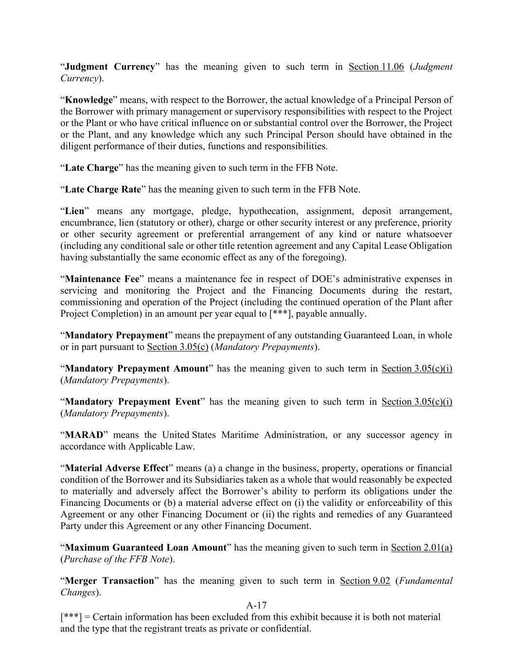 A-17 [***] = Certain information has been excluded from this exhibit because it is both not material and the type that the registrant treats as private or confidential. “Judgment Currency” has the meaning given to such term in Section 11.06 (Judgment Currency). “Knowledge” means, with respect to the Borrower, the actual knowledge of a Principal Person of the Borrower with primary management or supervisory responsibilities with respect to the Project or the Plant or who have critical influence on or substantial control over the Borrower, the Project or the Plant, and any knowledge which any such Principal Person should have obtained in the diligent performance of their duties, functions and responsibilities. “Late Charge” has the meaning given to such term in the FFB Note. “Late Charge Rate” has the meaning given to such term in the FFB Note. “Lien” means any mortgage, pledge, hypothecation, assignment, deposit arrangement, encumbrance, lien (statutory or other), charge or other security interest or any preference, priority or other security agreement or preferential arrangement of any kind or nature whatsoever (including any conditional sale or other title retention agreement and any Capital Lease Obligation having substantially the same economic effect as any of the foregoing). “Maintenance Fee” means a maintenance fee in respect of DOE’s administrative expenses in servicing and monitoring the Project and the Financing Documents during the restart, commissioning and operation of the Project (including the continued operation of the Plant after Project Completion) in an amount per year equal to [***], payable annually. “Mandatory Prepayment” means the prepayment of any outstanding Guaranteed Loan, in whole or in part pursuant to Section 3.05(c) (Mandatory Prepayments). “Mandatory Prepayment Amount” has the meaning given to such term in Section 3.05(c)(i) (Mandatory Prepayments). “Mandatory Prepayment Event” has the meaning given to such term in Section 3.05(c)(i) (Mandatory Prepayments). “MARAD” means the United States Maritime Administration, or any successor agency in accordance with Applicable Law. “Material Adverse Effect” means (a) a change in the business, property, operations or financial condition of the Borrower and its Subsidiaries taken as a whole that would reasonably be expected to materially and adversely affect the Borrower’s ability to perform its obligations under the Financing Documents or (b) a material adverse effect on (i) the validity or enforceability of this Agreement or any other Financing Document or (ii) the rights and remedies of any Guaranteed Party under this Agreement or any other Financing Document. “Maximum Guaranteed Loan Amount” has the meaning given to such term in Section 2.01(a) (Purchase of the FFB Note). “Merger Transaction” has the meaning given to such term in Section 9.02 (Fundamental Changes).