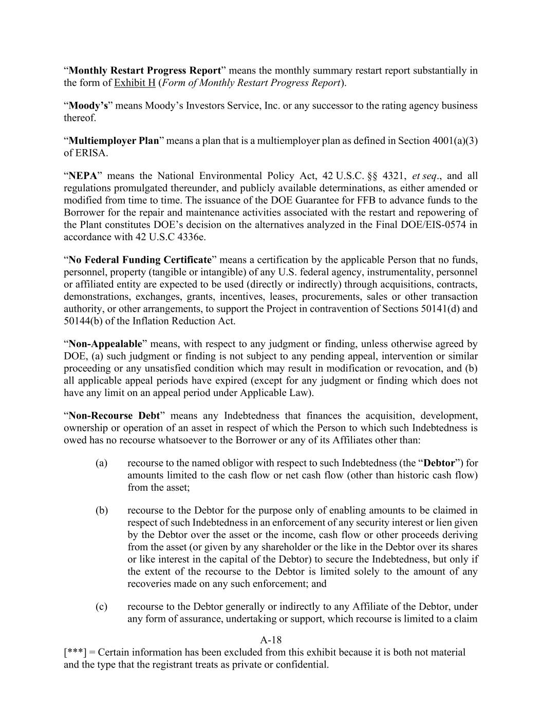 A-18 [***] = Certain information has been excluded from this exhibit because it is both not material and the type that the registrant treats as private or confidential. “Monthly Restart Progress Report” means the monthly summary restart report substantially in the form of Exhibit H (Form of Monthly Restart Progress Report). “Moody’s” means Moody’s Investors Service, Inc. or any successor to the rating agency business thereof. “Multiemployer Plan” means a plan that is a multiemployer plan as defined in Section 4001(a)(3) of ERISA. “NEPA” means the National Environmental Policy Act, 42 U.S.C. §§ 4321, et seq., and all regulations promulgated thereunder, and publicly available determinations, as either amended or modified from time to time. The issuance of the DOE Guarantee for FFB to advance funds to the Borrower for the repair and maintenance activities associated with the restart and repowering of the Plant constitutes DOE’s decision on the alternatives analyzed in the Final DOE/EIS-0574 in accordance with 42 U.S.C 4336e. “No Federal Funding Certificate” means a certification by the applicable Person that no funds, personnel, property (tangible or intangible) of any U.S. federal agency, instrumentality, personnel or affiliated entity are expected to be used (directly or indirectly) through acquisitions, contracts, demonstrations, exchanges, grants, incentives, leases, procurements, sales or other transaction authority, or other arrangements, to support the Project in contravention of Sections 50141(d) and 50144(b) of the Inflation Reduction Act. “Non-Appealable” means, with respect to any judgment or finding, unless otherwise agreed by DOE, (a) such judgment or finding is not subject to any pending appeal, intervention or similar proceeding or any unsatisfied condition which may result in modification or revocation, and (b) all applicable appeal periods have expired (except for any judgment or finding which does not have any limit on an appeal period under Applicable Law). “Non-Recourse Debt” means any Indebtedness that finances the acquisition, development, ownership or operation of an asset in respect of which the Person to which such Indebtedness is owed has no recourse whatsoever to the Borrower or any of its Affiliates other than: (a) recourse to the named obligor with respect to such Indebtedness (the “Debtor”) for amounts limited to the cash flow or net cash flow (other than historic cash flow) from the asset; (b) recourse to the Debtor for the purpose only of enabling amounts to be claimed in respect of such Indebtedness in an enforcement of any security interest or lien given by the Debtor over the asset or the income, cash flow or other proceeds deriving from the asset (or given by any shareholder or the like in the Debtor over its shares or like interest in the capital of the Debtor) to secure the Indebtedness, but only if the extent of the recourse to the Debtor is limited solely to the amount of any recoveries made on any such enforcement; and (c) recourse to the Debtor generally or indirectly to any Affiliate of the Debtor, under any form of assurance, undertaking or support, which recourse is limited to a claim