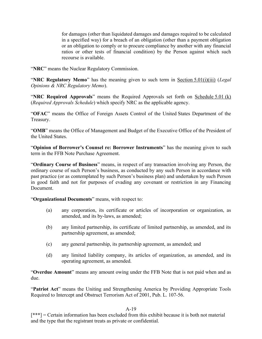 A-19 [***] = Certain information has been excluded from this exhibit because it is both not material and the type that the registrant treats as private or confidential. for damages (other than liquidated damages and damages required to be calculated in a specified way) for a breach of an obligation (other than a payment obligation or an obligation to comply or to procure compliance by another with any financial ratios or other tests of financial condition) by the Person against which such recourse is available. “NRC” means the Nuclear Regulatory Commission. “NRC Regulatory Memo” has the meaning given to such term in Section 5.01(i)(iii) (Legal Opinions & NRC Regulatory Memo). “NRC Required Approvals” means the Required Approvals set forth on Schedule 5.01 (k) (Required Approvals Schedule) which specify NRC as the applicable agency. “OFAC” means the Office of Foreign Assets Control of the United States Department of the Treasury. “OMB” means the Office of Management and Budget of the Executive Office of the President of the United States. “Opinion of Borrower’s Counsel re: Borrower Instruments” has the meaning given to such term in the FFB Note Purchase Agreement. “Ordinary Course of Business” means, in respect of any transaction involving any Person, the ordinary course of such Person’s business, as conducted by any such Person in accordance with past practice (or as contemplated by such Person’s business plan) and undertaken by such Person in good faith and not for purposes of evading any covenant or restriction in any Financing Document. “Organizational Documents” means, with respect to: (a) any corporation, its certificate or articles of incorporation or organization, as amended, and its by-laws, as amended; (b) any limited partnership, its certificate of limited partnership, as amended, and its partnership agreement, as amended; (c) any general partnership, its partnership agreement, as amended; and (d) any limited liability company, its articles of organization, as amended, and its operating agreement, as amended. “Overdue Amount” means any amount owing under the FFB Note that is not paid when and as due. “Patriot Act” means the Uniting and Strengthening America by Providing Appropriate Tools Required to Intercept and Obstruct Terrorism Act of 2001, Pub. L. 107-56.