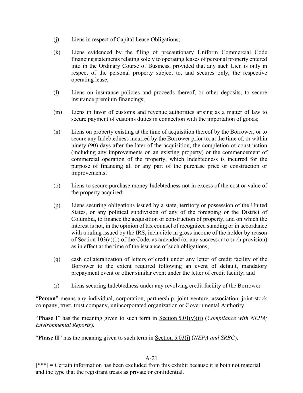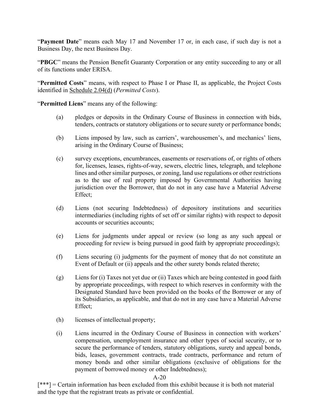 A-20 [***] = Certain information has been excluded from this exhibit because it is both not material and the type that the registrant treats as private or confidential. “Payment Date” means each May 17 and November 17 or, in each case, if such day is not a Business Day, the next Business Day. “PBGC” means the Pension Benefit Guaranty Corporation or any entity succeeding to any or all of its functions under ERISA. “Permitted Costs” means, with respect to Phase I or Phase II, as applicable, the Project Costs identified in Schedule 2.04(d) (Permitted Costs). “Permitted Liens” means any of the following: (a) pledges or deposits in the Ordinary Course of Business in connection with bids, tenders, contracts or statutory obligations or to secure surety or performance bonds; (b) Liens imposed by law, such as carriers’, warehousemen’s, and mechanics’ liens, arising in the Ordinary Course of Business; (c) survey exceptions, encumbrances, easements or reservations of, or rights of others for, licenses, leases, rights-of-way, sewers, electric lines, telegraph, and telephone lines and other similar purposes, or zoning, land use regulations or other restrictions as to the use of real property imposed by Governmental Authorities having jurisdiction over the Borrower, that do not in any case have a Material Adverse Effect; (d) Liens (not securing Indebtedness) of depository institutions and securities intermediaries (including rights of set off or similar rights) with respect to deposit accounts or securities accounts; (e) Liens for judgments under appeal or review (so long as any such appeal or proceeding for review is being pursued in good faith by appropriate proceedings); (f) Liens securing (i) judgments for the payment of money that do not constitute an Event of Default or (ii) appeals and the other surety bonds related thereto; (g) Liens for (i) Taxes not yet due or (ii) Taxes which are being contested in good faith by appropriate proceedings, with respect to which reserves in conformity with the Designated Standard have been provided on the books of the Borrower or any of its Subsidiaries, as applicable, and that do not in any case have a Material Adverse Effect; (h) licenses of intellectual property; (i) Liens incurred in the Ordinary Course of Business in connection with workers’ compensation, unemployment insurance and other types of social security, or to secure the performance of tenders, statutory obligations, surety and appeal bonds, bids, leases, government contracts, trade contracts, performance and return of money bonds and other similar obligations (exclusive of obligations for the payment of borrowed money or other Indebtedness);