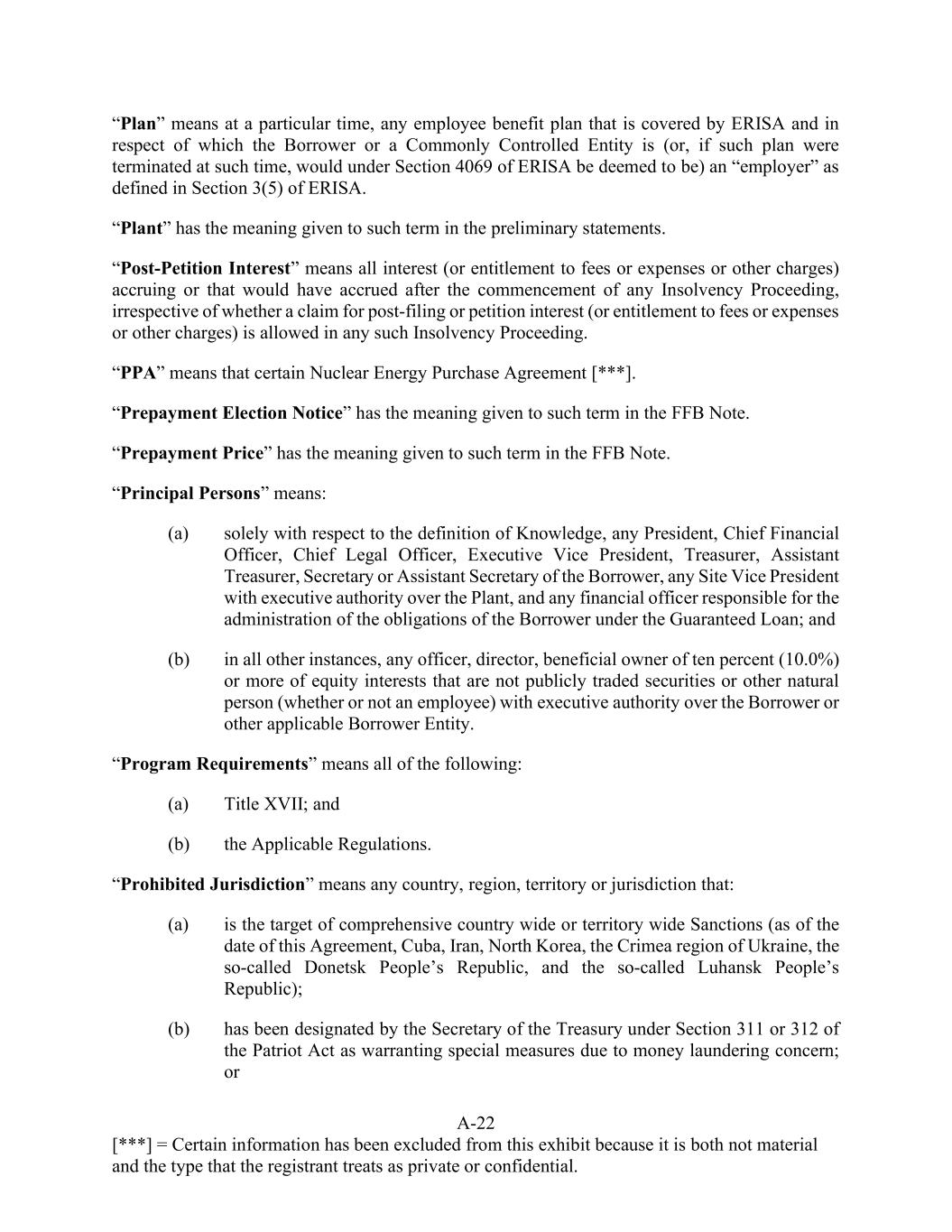 A-22 [***] = Certain information has been excluded from this exhibit because it is both not material and the type that the registrant treats as private or confidential. “Plan” means at a particular time, any employee benefit plan that is covered by ERISA and in respect of which the Borrower or a Commonly Controlled Entity is (or, if such plan were terminated at such time, would under Section 4069 of ERISA be deemed to be) an “employer” as defined in Section 3(5) of ERISA. “Plant” has the meaning given to such term in the preliminary statements. “Post-Petition Interest” means all interest (or entitlement to fees or expenses or other charges) accruing or that would have accrued after the commencement of any Insolvency Proceeding, irrespective of whether a claim for post-filing or petition interest (or entitlement to fees or expenses or other charges) is allowed in any such Insolvency Proceeding. “PPA” means that certain Nuclear Energy Purchase Agreement [***]. “Prepayment Election Notice” has the meaning given to such term in the FFB Note. “Prepayment Price” has the meaning given to such term in the FFB Note. “Principal Persons” means: (a) solely with respect to the definition of Knowledge, any President, Chief Financial Officer, Chief Legal Officer, Executive Vice President, Treasurer, Assistant Treasurer, Secretary or Assistant Secretary of the Borrower, any Site Vice President with executive authority over the Plant, and any financial officer responsible for the administration of the obligations of the Borrower under the Guaranteed Loan; and (b) in all other instances, any officer, director, beneficial owner of ten percent (10.0%) or more of equity interests that are not publicly traded securities or other natural person (whether or not an employee) with executive authority over the Borrower or other applicable Borrower Entity. “Program Requirements” means all of the following: (a) Title XVII; and (b) the Applicable Regulations. “Prohibited Jurisdiction” means any country, region, territory or jurisdiction that: (a) is the target of comprehensive country wide or territory wide Sanctions (as of the date of this Agreement, Cuba, Iran, North Korea, the Crimea region of Ukraine, the so-called Donetsk People’s Republic, and the so-called Luhansk People’s Republic); (b) has been designated by the Secretary of the Treasury under Section 311 or 312 of the Patriot Act as warranting special measures due to money laundering concern; or