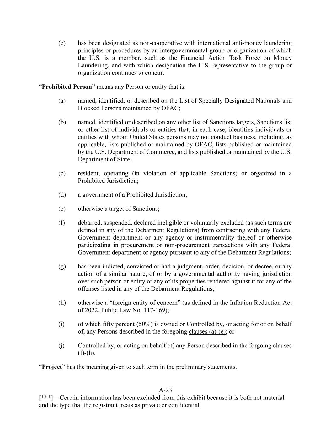 A-23 [***] = Certain information has been excluded from this exhibit because it is both not material and the type that the registrant treats as private or confidential. (c) has been designated as non-cooperative with international anti-money laundering principles or procedures by an intergovernmental group or organization of which the U.S. is a member, such as the Financial Action Task Force on Money Laundering, and with which designation the U.S. representative to the group or organization continues to concur. “Prohibited Person” means any Person or entity that is: (a) named, identified, or described on the List of Specially Designated Nationals and Blocked Persons maintained by OFAC; (b) named, identified or described on any other list of Sanctions targets, Sanctions list or other list of individuals or entities that, in each case, identifies individuals or entities with whom United States persons may not conduct business, including, as applicable, lists published or maintained by OFAC, lists published or maintained by the U.S. Department of Commerce, and lists published or maintained by the U.S. Department of State; (c) resident, operating (in violation of applicable Sanctions) or organized in a Prohibited Jurisdiction; (d) a government of a Prohibited Jurisdiction; (e) otherwise a target of Sanctions; (f) debarred, suspended, declared ineligible or voluntarily excluded (as such terms are defined in any of the Debarment Regulations) from contracting with any Federal Government department or any agency or instrumentality thereof or otherwise participating in procurement or non-procurement transactions with any Federal Government department or agency pursuant to any of the Debarment Regulations; (g) has been indicted, convicted or had a judgment, order, decision, or decree, or any action of a similar nature, of or by a governmental authority having jurisdiction over such person or entity or any of its properties rendered against it for any of the offenses listed in any of the Debarment Regulations; (h) otherwise a “foreign entity of concern” (as defined in the Inflation Reduction Act of 2022, Public Law No. 117-169); (i) of which fifty percent (50%) is owned or Controlled by, or acting for or on behalf of, any Persons described in the foregoing clauses (a)-(e); or (j) Controlled by, or acting on behalf of, any Person described in the forgoing clauses (f)-(h). “Project” has the meaning given to such term in the preliminary statements.