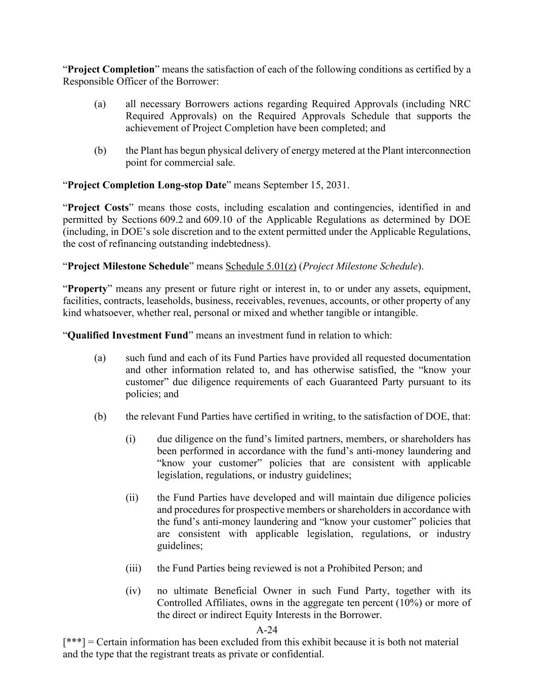 A-24 [***] = Certain information has been excluded from this exhibit because it is both not material and the type that the registrant treats as private or confidential. “Project Completion” means the satisfaction of each of the following conditions as certified by a Responsible Officer of the Borrower: (a) all necessary Borrowers actions regarding Required Approvals (including NRC Required Approvals) on the Required Approvals Schedule that supports the achievement of Project Completion have been completed; and (b) the Plant has begun physical delivery of energy metered at the Plant interconnection point for commercial sale. “Project Completion Long-stop Date” means September 15, 2031. “Project Costs” means those costs, including escalation and contingencies, identified in and permitted by Sections 609.2 and 609.10 of the Applicable Regulations as determined by DOE (including, in DOE’s sole discretion and to the extent permitted under the Applicable Regulations, the cost of refinancing outstanding indebtedness). “Project Milestone Schedule” means Schedule 5.01(z) (Project Milestone Schedule). “Property” means any present or future right or interest in, to or under any assets, equipment, facilities, contracts, leaseholds, business, receivables, revenues, accounts, or other property of any kind whatsoever, whether real, personal or mixed and whether tangible or intangible. “Qualified Investment Fund” means an investment fund in relation to which: (a) such fund and each of its Fund Parties have provided all requested documentation and other information related to, and has otherwise satisfied, the “know your customer” due diligence requirements of each Guaranteed Party pursuant to its policies; and (b) the relevant Fund Parties have certified in writing, to the satisfaction of DOE, that: (i) due diligence on the fund’s limited partners, members, or shareholders has been performed in accordance with the fund’s anti-money laundering and “know your customer” policies that are consistent with applicable legislation, regulations, or industry guidelines; (ii) the Fund Parties have developed and will maintain due diligence policies and procedures for prospective members or shareholders in accordance with the fund’s anti-money laundering and “know your customer” policies that are consistent with applicable legislation, regulations, or industry guidelines; (iii) the Fund Parties being reviewed is not a Prohibited Person; and (iv) no ultimate Beneficial Owner in such Fund Party, together with its Controlled Affiliates, owns in the aggregate ten percent (10%) or more of the direct or indirect Equity Interests in the Borrower.