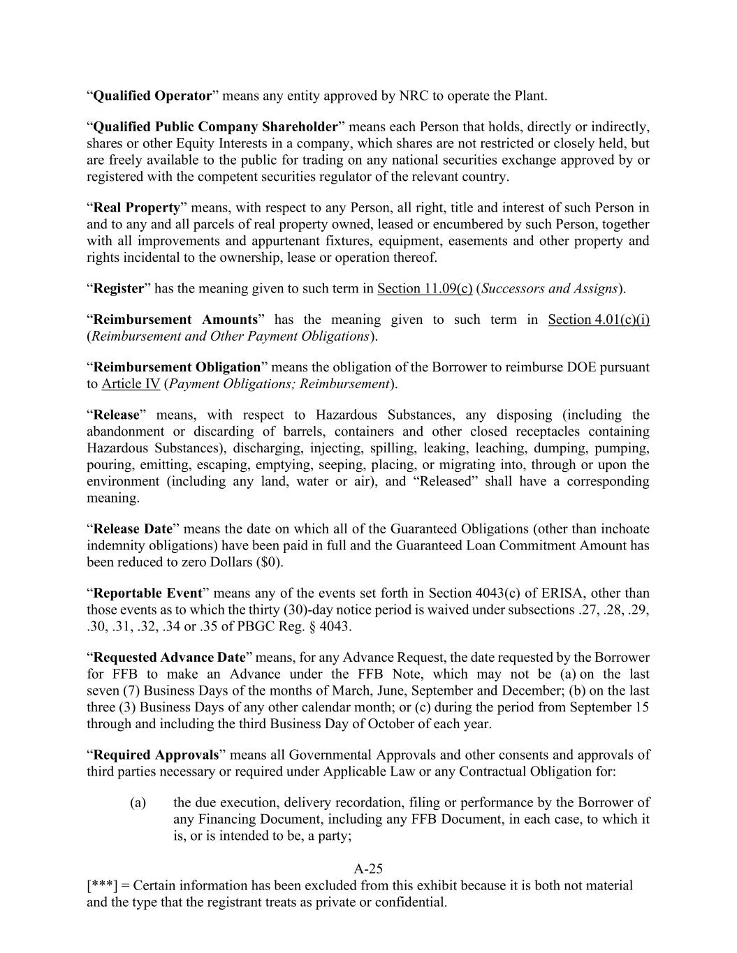 A-25 [***] = Certain information has been excluded from this exhibit because it is both not material and the type that the registrant treats as private or confidential. “Qualified Operator” means any entity approved by NRC to operate the Plant. “Qualified Public Company Shareholder” means each Person that holds, directly or indirectly, shares or other Equity Interests in a company, which shares are not restricted or closely held, but are freely available to the public for trading on any national securities exchange approved by or registered with the competent securities regulator of the relevant country. “Real Property” means, with respect to any Person, all right, title and interest of such Person in and to any and all parcels of real property owned, leased or encumbered by such Person, together with all improvements and appurtenant fixtures, equipment, easements and other property and rights incidental to the ownership, lease or operation thereof. “Register” has the meaning given to such term in Section 11.09(c) (Successors and Assigns). “Reimbursement Amounts” has the meaning given to such term in Section 4.01(c)(i) (Reimbursement and Other Payment Obligations). “Reimbursement Obligation” means the obligation of the Borrower to reimburse DOE pursuant to Article IV (Payment Obligations; Reimbursement). “Release” means, with respect to Hazardous Substances, any disposing (including the abandonment or discarding of barrels, containers and other closed receptacles containing Hazardous Substances), discharging, injecting, spilling, leaking, leaching, dumping, pumping, pouring, emitting, escaping, emptying, seeping, placing, or migrating into, through or upon the environment (including any land, water or air), and “Released” shall have a corresponding meaning. “Release Date” means the date on which all of the Guaranteed Obligations (other than inchoate indemnity obligations) have been paid in full and the Guaranteed Loan Commitment Amount has been reduced to zero Dollars ($0). “Reportable Event” means any of the events set forth in Section 4043(c) of ERISA, other than those events as to which the thirty (30)-day notice period is waived under subsections .27, .28, .29, .30, .31, .32, .34 or .35 of PBGC Reg. § 4043. “Requested Advance Date” means, for any Advance Request, the date requested by the Borrower for FFB to make an Advance under the FFB Note, which may not be (a) on the last seven (7) Business Days of the months of March, June, September and December; (b) on the last three (3) Business Days of any other calendar month; or (c) during the period from September 15 through and including the third Business Day of October of each year. “Required Approvals” means all Governmental Approvals and other consents and approvals of third parties necessary or required under Applicable Law or any Contractual Obligation for: (a) the due execution, delivery recordation, filing or performance by the Borrower of any Financing Document, including any FFB Document, in each case, to which it is, or is intended to be, a party;