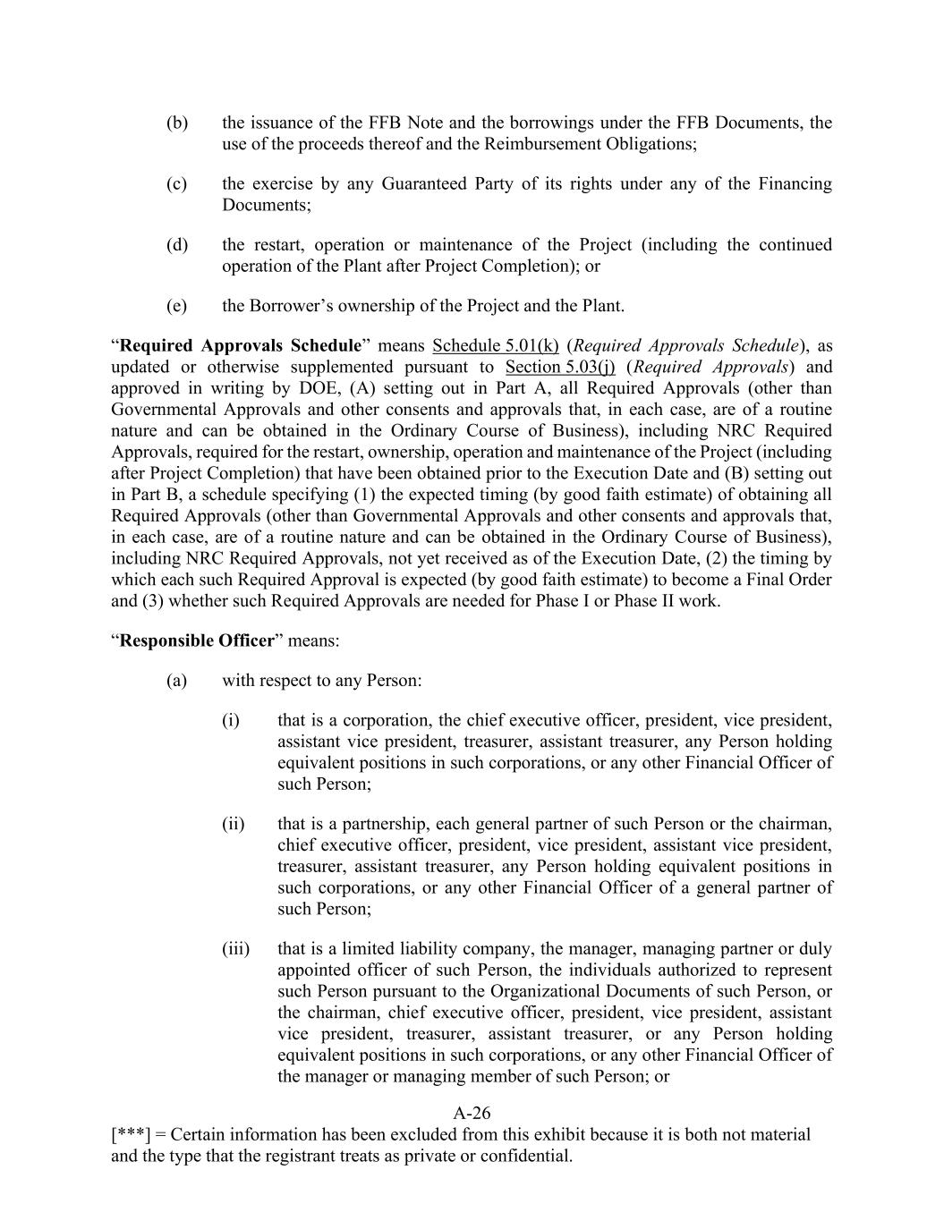 A-26 [***] = Certain information has been excluded from this exhibit because it is both not material and the type that the registrant treats as private or confidential. (b) the issuance of the FFB Note and the borrowings under the FFB Documents, the use of the proceeds thereof and the Reimbursement Obligations; (c) the exercise by any Guaranteed Party of its rights under any of the Financing Documents; (d) the restart, operation or maintenance of the Project (including the continued operation of the Plant after Project Completion); or (e) the Borrower’s ownership of the Project and the Plant. “Required Approvals Schedule” means Schedule 5.01(k) (Required Approvals Schedule), as updated or otherwise supplemented pursuant to Section 5.03(j) (Required Approvals) and approved in writing by DOE, (A) setting out in Part A, all Required Approvals (other than Governmental Approvals and other consents and approvals that, in each case, are of a routine nature and can be obtained in the Ordinary Course of Business), including NRC Required Approvals, required for the restart, ownership, operation and maintenance of the Project (including after Project Completion) that have been obtained prior to the Execution Date and (B) setting out in Part B, a schedule specifying (1) the expected timing (by good faith estimate) of obtaining all Required Approvals (other than Governmental Approvals and other consents and approvals that, in each case, are of a routine nature and can be obtained in the Ordinary Course of Business), including NRC Required Approvals, not yet received as of the Execution Date, (2) the timing by which each such Required Approval is expected (by good faith estimate) to become a Final Order and (3) whether such Required Approvals are needed for Phase I or Phase II work. “Responsible Officer” means: (a) with respect to any Person: (i) that is a corporation, the chief executive officer, president, vice president, assistant vice president, treasurer, assistant treasurer, any Person holding equivalent positions in such corporations, or any other Financial Officer of such Person; (ii) that is a partnership, each general partner of such Person or the chairman, chief executive officer, president, vice president, assistant vice president, treasurer, assistant treasurer, any Person holding equivalent positions in such corporations, or any other Financial Officer of a general partner of such Person; (iii) that is a limited liability company, the manager, managing partner or duly appointed officer of such Person, the individuals authorized to represent such Person pursuant to the Organizational Documents of such Person, or the chairman, chief executive officer, president, vice president, assistant vice president, treasurer, assistant treasurer, or any Person holding equivalent positions in such corporations, or any other Financial Officer of the manager or managing member of such Person; or