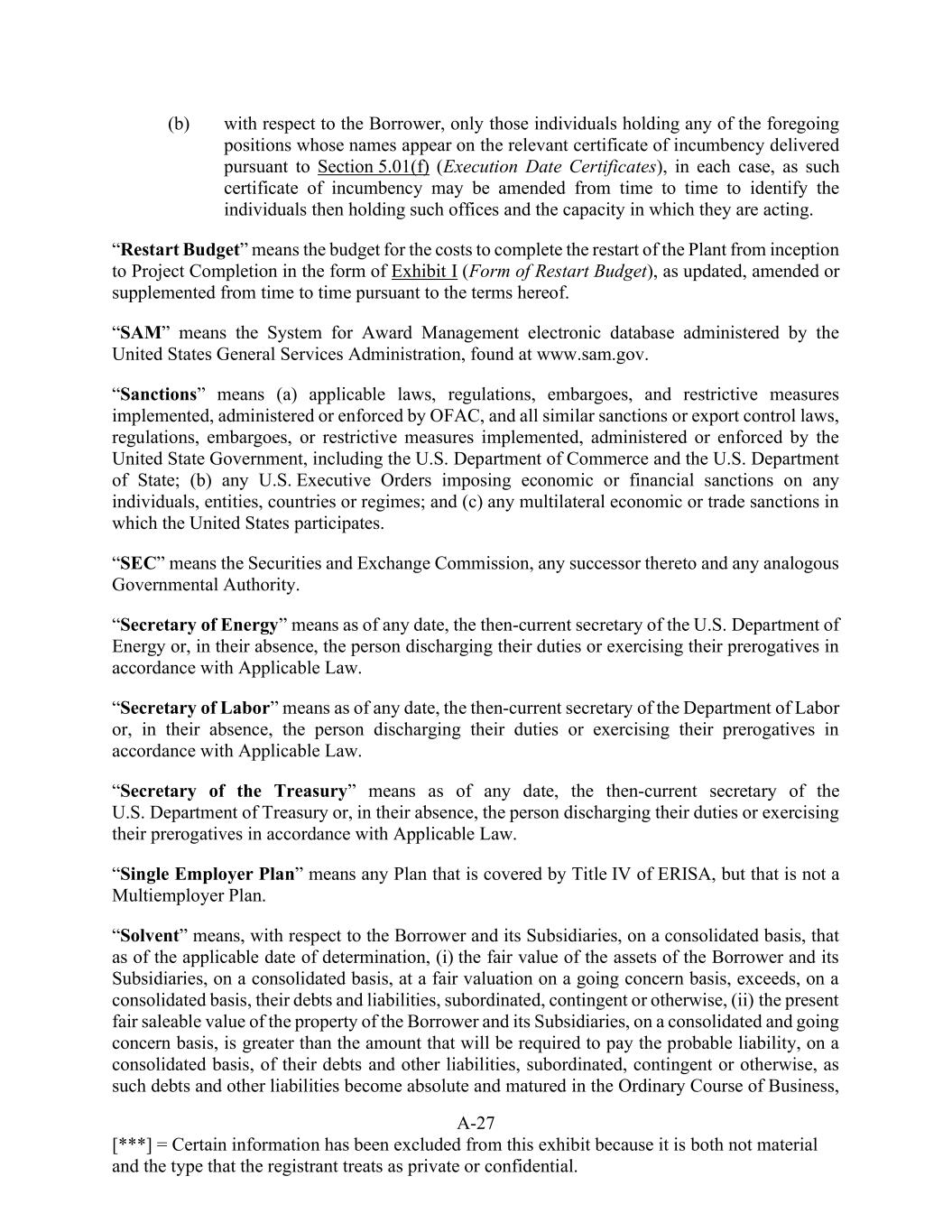 A-27 [***] = Certain information has been excluded from this exhibit because it is both not material and the type that the registrant treats as private or confidential. (b) with respect to the Borrower, only those individuals holding any of the foregoing positions whose names appear on the relevant certificate of incumbency delivered pursuant to Section 5.01(f) (Execution Date Certificates), in each case, as such certificate of incumbency may be amended from time to time to identify the individuals then holding such offices and the capacity in which they are acting. “Restart Budget” means the budget for the costs to complete the restart of the Plant from inception to Project Completion in the form of Exhibit I (Form of Restart Budget), as updated, amended or supplemented from time to time pursuant to the terms hereof. “SAM” means the System for Award Management electronic database administered by the United States General Services Administration, found at www.sam.gov. “Sanctions” means (a) applicable laws, regulations, embargoes, and restrictive measures implemented, administered or enforced by OFAC, and all similar sanctions or export control laws, regulations, embargoes, or restrictive measures implemented, administered or enforced by the United State Government, including the U.S. Department of Commerce and the U.S. Department of State; (b) any U.S. Executive Orders imposing economic or financial sanctions on any individuals, entities, countries or regimes; and (c) any multilateral economic or trade sanctions in which the United States participates. “SEC” means the Securities and Exchange Commission, any successor thereto and any analogous Governmental Authority. “Secretary of Energy” means as of any date, the then-current secretary of the U.S. Department of Energy or, in their absence, the person discharging their duties or exercising their prerogatives in accordance with Applicable Law. “Secretary of Labor” means as of any date, the then-current secretary of the Department of Labor or, in their absence, the person discharging their duties or exercising their prerogatives in accordance with Applicable Law. “Secretary of the Treasury” means as of any date, the then-current secretary of the U.S. Department of Treasury or, in their absence, the person discharging their duties or exercising their prerogatives in accordance with Applicable Law. “Single Employer Plan” means any Plan that is covered by Title IV of ERISA, but that is not a Multiemployer Plan. “Solvent” means, with respect to the Borrower and its Subsidiaries, on a consolidated basis, that as of the applicable date of determination, (i) the fair value of the assets of the Borrower and its Subsidiaries, on a consolidated basis, at a fair valuation on a going concern basis, exceeds, on a consolidated basis, their debts and liabilities, subordinated, contingent or otherwise, (ii) the present fair saleable value of the property of the Borrower and its Subsidiaries, on a consolidated and going concern basis, is greater than the amount that will be required to pay the probable liability, on a consolidated basis, of their debts and other liabilities, subordinated, contingent or otherwise, as such debts and other liabilities become absolute and matured in the Ordinary Course of Business,