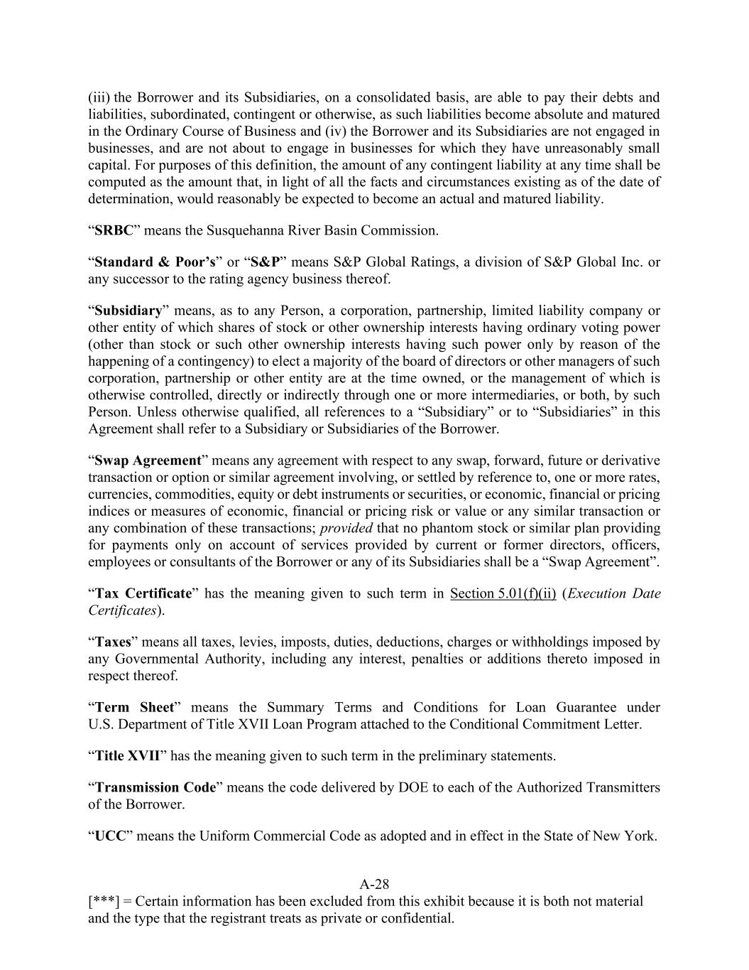 A-28 [***] = Certain information has been excluded from this exhibit because it is both not material and the type that the registrant treats as private or confidential. (iii) the Borrower and its Subsidiaries, on a consolidated basis, are able to pay their debts and liabilities, subordinated, contingent or otherwise, as such liabilities become absolute and matured in the Ordinary Course of Business and (iv) the Borrower and its Subsidiaries are not engaged in businesses, and are not about to engage in businesses for which they have unreasonably small capital. For purposes of this definition, the amount of any contingent liability at any time shall be computed as the amount that, in light of all the facts and circumstances existing as of the date of determination, would reasonably be expected to become an actual and matured liability. “SRBC” means the Susquehanna River Basin Commission. “Standard & Poor’s” or “S&P” means S&P Global Ratings, a division of S&P Global Inc. or any successor to the rating agency business thereof. “Subsidiary” means, as to any Person, a corporation, partnership, limited liability company or other entity of which shares of stock or other ownership interests having ordinary voting power (other than stock or such other ownership interests having such power only by reason of the happening of a contingency) to elect a majority of the board of directors or other managers of such corporation, partnership or other entity are at the time owned, or the management of which is otherwise controlled, directly or indirectly through one or more intermediaries, or both, by such Person. Unless otherwise qualified, all references to a “Subsidiary” or to “Subsidiaries” in this Agreement shall refer to a Subsidiary or Subsidiaries of the Borrower. “Swap Agreement” means any agreement with respect to any swap, forward, future or derivative transaction or option or similar agreement involving, or settled by reference to, one or more rates, currencies, commodities, equity or debt instruments or securities, or economic, financial or pricing indices or measures of economic, financial or pricing risk or value or any similar transaction or any combination of these transactions; provided that no phantom stock or similar plan providing for payments only on account of services provided by current or former directors, officers, employees or consultants of the Borrower or any of its Subsidiaries shall be a “Swap Agreement”. “Tax Certificate” has the meaning given to such term in Section 5.01(f)(ii) (Execution Date Certificates). “Taxes” means all taxes, levies, imposts, duties, deductions, charges or withholdings imposed by any Governmental Authority, including any interest, penalties or additions thereto imposed in respect thereof. “Term Sheet” means the Summary Terms and Conditions for Loan Guarantee under U.S. Department of Title XVII Loan Program attached to the Conditional Commitment Letter. “Title XVII” has the meaning given to such term in the preliminary statements. “Transmission Code” means the code delivered by DOE to each of the Authorized Transmitters of the Borrower. “UCC” means the Uniform Commercial Code as adopted and in effect in the State of New York.