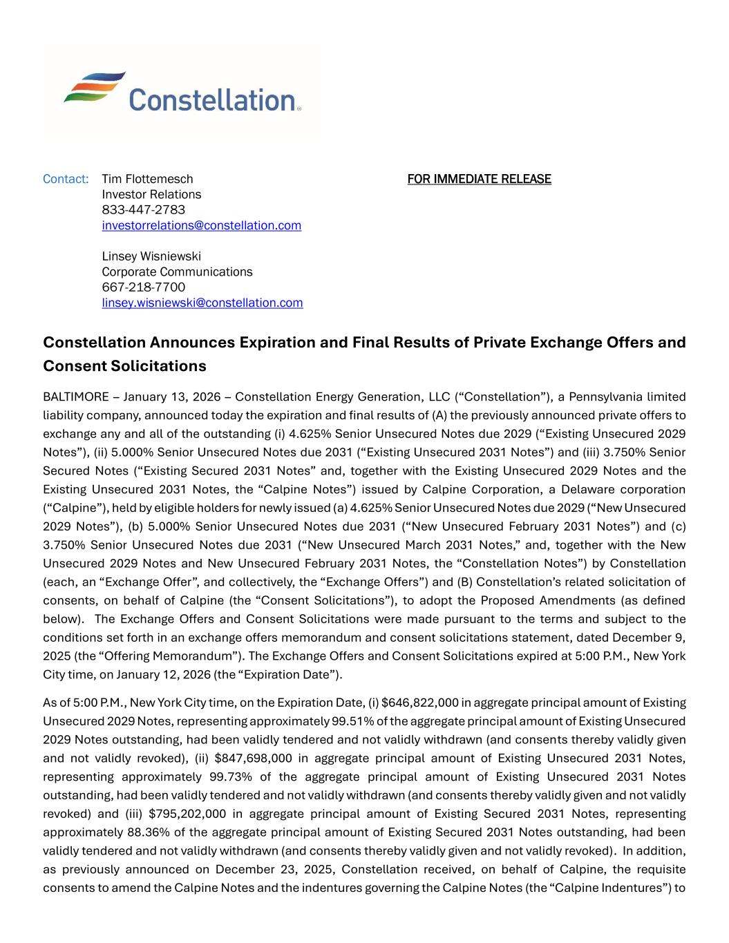 eliminate substantially all of the restrictive covenants and events of default, other than the payment-related and bankruptcy-related events of default (collectively, the “Proposed Amendments”). Consents of the holders of at least 66 2/3% in aggregate principal amount of the Existing 2031 Secured Notes have been received, and therefore the Proposed Amendments will also provide that the Existing Secured 2031 Notes Indenture will be amended to eliminate the security interest granted thereunder and to release the collateral securing the Existing 2031 Secured Notes. As of the Expiration Date, the conditions required for the consummation of the Exchange Offers, as detailed in the Offering Memorandum, had been met or waived, including the consummation of the Company's acquisition of Calpine, which occurred on January 7, 2026. For each $1,000 principal amount of Calpine Notes validly tendered in the Exchange Offers, not validly withdrawn by December 22, 2025 (the “Early Tender Deadline”) and accepted for exchange, the eligible holder of such Calpine Notes will receive Constellation Notes in an equal principal amount as the tendered Calpine Notes and cash consideration (the “Cash Consideration” and, together with such amount of Constellation Notes, the “Total Exchange Consideration”) of approximately (i) $1.00 per $1,000 principal amount of Calpine Notes (with respect to the Existing Unsecured 2029 Notes), (ii) $1.00 per $1,000 principal amount of Calpine Notes (with respect to the Existing Unsecured 2031 Notes) and (iii) $2.83 per $1,000 principal amount of Calpine Notes (with respect to the Existing Secured 2031 Notes). Eligible holders who validly tender their Calpine Notes after the Early Tender Deadline but on or prior to the Expiration Date will receive $970 principal amount of the Constellation Notes per $1,000 principal amount of Calpine Notes validly tendered but no Cash Consideration (the “Exchange Consideration”). The settlement of the Exchange Offers is expected to occur on or around January 15, 2026. The Exchange Offers were made only to holders of Calpine Notes who satisfied the eligibility conditions described under “Disclaimer” below. Eligible holders of Calpine Notes may obtain copies of the Offering Memorandum from D.F. King & Co., Inc., the information agent and exchange agent for the Exchange Offers and Consent Solicitations, at (866) 796-3441 or via e-mail at CEG@dfking.com. Banks and brokers should call (212) 448-4476. Disclaimer This press release is neither an offer to sell nor the solicitation of an offer to buy the Constellation Notes or any other securities and shall not constitute an offer, solicitation or sale in any jurisdiction in which, or to any person to whom, such an offer, solicitation or sale is unlawful. The Exchange Offers have not been and will not be registered under the Securities Act of 1933, as amended (the “Securities Act”), or the securities laws of any other jurisdiction, and, accordingly, the Constellation Notes will be subject to transfer restrictions unless and until the Constellation Notes are registered or exchanged for registered notes. The Constellation Notes will be issued in reliance upon exemptions from, or in transactions not subject to, registration under the Securities Act. The Exchange Offers are being made only to, and the Constellation Notes will be offered for exchange only to, holders of Calpine Notes who are (i) reasonably believed to be “qualified institutional buyers” (as defined in Rule 144A under the Securities Act) in reliance on the exemption from registration provided by Section 4(a)(2) of the Securities Act, and (ii) outside the United States, persons who are not, and who are not acting for the account or benefit of, “U.S. persons” (as defined in Rule 902 under the Securities Act) in compliance with Regulation S under the Securities Act. The Constellation Notes will not be offered or sold in the United States or to U.S. persons (as defined in Rule 902 under the Securities Act) unless the transaction is registered under the Securities Act, an exemption from the registration requirements of the Securities Act is available or the transaction is not subject to registration under the Securities Act. The Exchange Offers and Consent Solicitations are being made only pursuant to the Offering Memorandum. The Offering Memorandum and other documents relating to the Exchange Offers and Consent Solicitations will be distributed only to holders of Calpine Notes who confirm that they are within the categories of eligible participants