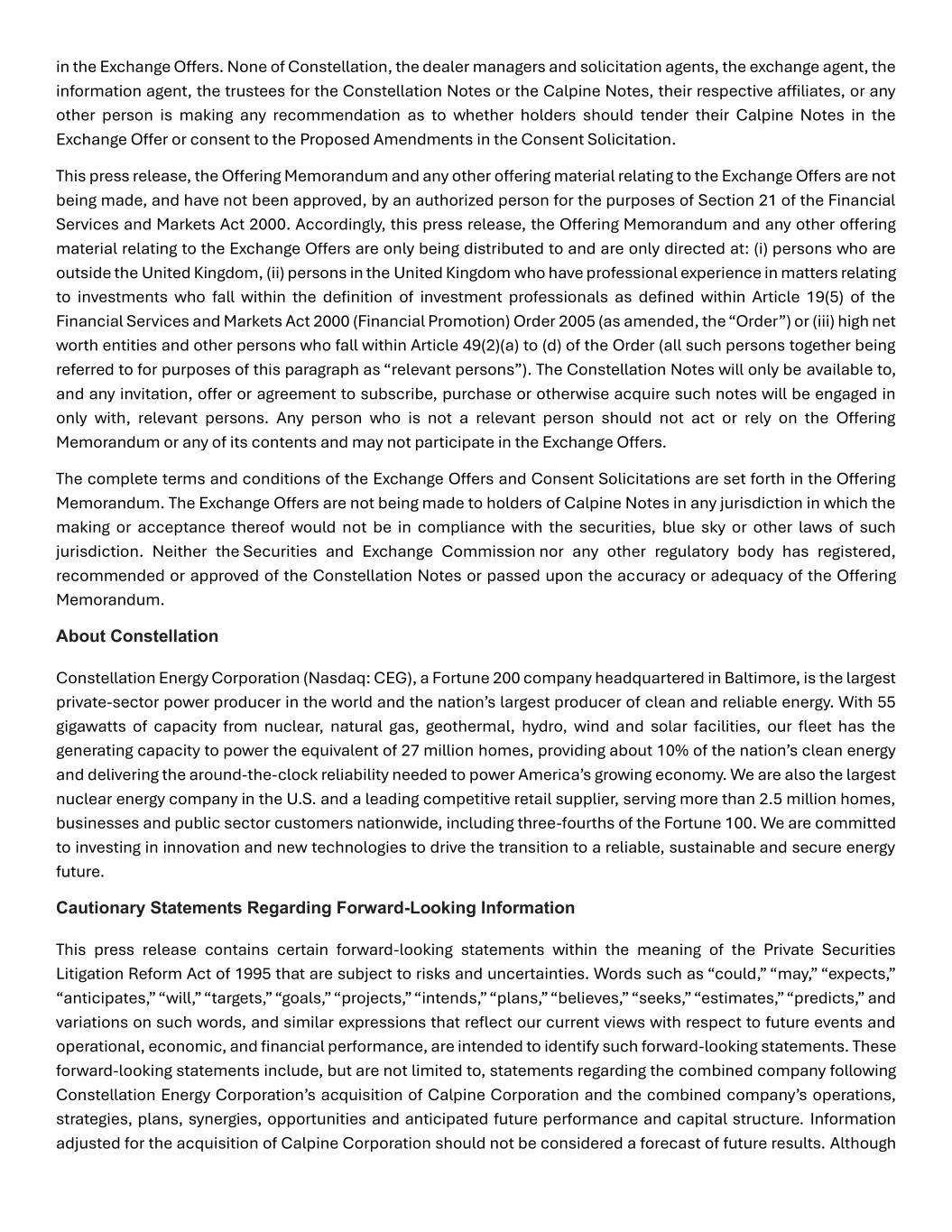 in the Exchange Offers. None of Constellation, the dealer managers and solicitation agents, the exchange agent, the information agent, the trustees for the Constellation Notes or the Calpine Notes, their respective affiliates, or any other person is making any recommendation as to whether holders should tender their Calpine Notes in the Exchange Offer or consent to the Proposed Amendments in the Consent Solicitation. This press release, the Offering Memorandum and any other offering material relating to the Exchange Offers are not being made, and have not been approved, by an authorized person for the purposes of Section 21 of the Financial Services and Markets Act 2000. Accordingly, this press release, the Offering Memorandum and any other offering material relating to the Exchange Offers are only being distributed to and are only directed at: (i) persons who are outside the United Kingdom, (ii) persons in the United Kingdom who have professional experience in matters relating to investments who fall within the definition of investment professionals as defined within Article 19(5) of the Financial Services and Markets Act 2000 (Financial Promotion) Order 2005 (as amended, the “Order”) or (iii) high net worth entities and other persons who fall within Article 49(2)(a) to (d) of the Order (all such persons together being referred to for purposes of this paragraph as “relevant persons”). The Constellation Notes will only be available to, and any invitation, offer or agreement to subscribe, purchase or otherwise acquire such notes will be engaged in only with, relevant persons. Any person who is not a relevant person should not act or rely on the Offering Memorandum or any of its contents and may not participate in the Exchange Offers. The complete terms and conditions of the Exchange Offers and Consent Solicitations are set forth in the Offering Memorandum. The Exchange Offers are not being made to holders of Calpine Notes in any jurisdiction in which the making or acceptance thereof would not be in compliance with the securities, blue sky or other laws of such jurisdiction. Neither the Securities and Exchange Commission nor any other regulatory body has registered, recommended or approved of the Constellation Notes or passed upon the accuracy or adequacy of the Offering Memorandum. About Constellation Constellation Energy Corporation (Nasdaq: CEG), a Fortune 200 company headquartered in Baltimore, is the largest private-sector power producer in the world and the nation’s largest producer of clean and reliable energy. With 55 gigawatts of capacity from nuclear, natural gas, geothermal, hydro, wind and solar facilities, our fleet has the generating capacity to power the equivalent of 27 million homes, providing about 10% of the nation’s clean energy and delivering the around-the-clock reliability needed to power America’s growing economy. We are also the largest nuclear energy company in the U.S. and a leading competitive retail supplier, serving more than 2.5 million homes, businesses and public sector customers nationwide, including three-fourths of the Fortune 100. We are committed to investing in innovation and new technologies to drive the transition to a reliable, sustainable and secure energy future. Cautionary Statements Regarding Forward-Looking Information This press release contains certain forward-looking statements within the meaning of the Private Securities Litigation Reform Act of 1995 that are subject to risks and uncertainties. Words such as “could,” “may,” “expects,” “anticipates,” “will,” “targets,” “goals,” “projects,” “intends,” “plans,” “believes,” “seeks,” “estimates,” “predicts,” and variations on such words, and similar expressions that reflect our current views with respect to future events and operational, economic, and financial performance, are intended to identify such forward-looking statements. These forward-looking statements include, but are not limited to, statements regarding the combined company following Constellation Energy Corporation’s acquisition of Calpine Corporation and the combined company’s operations, strategies, plans, synergies, opportunities and anticipated future performance and capital structure. Information adjusted for the acquisition of Calpine Corporation should not be considered a forecast of future results. Although