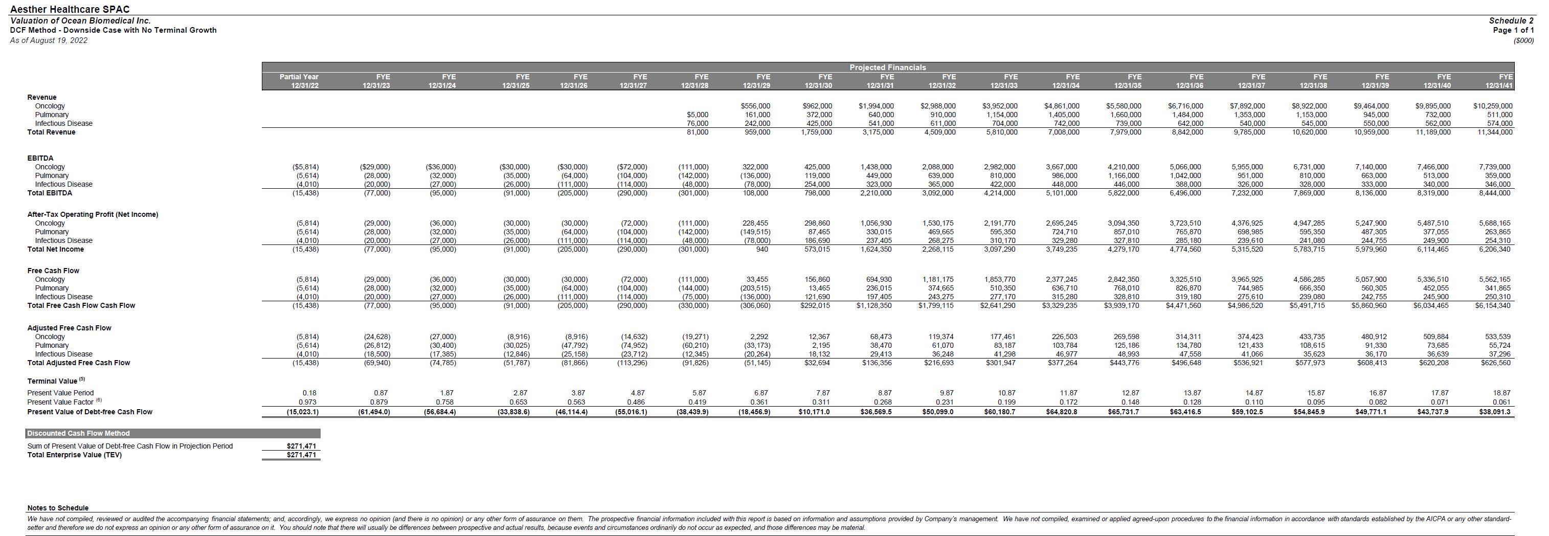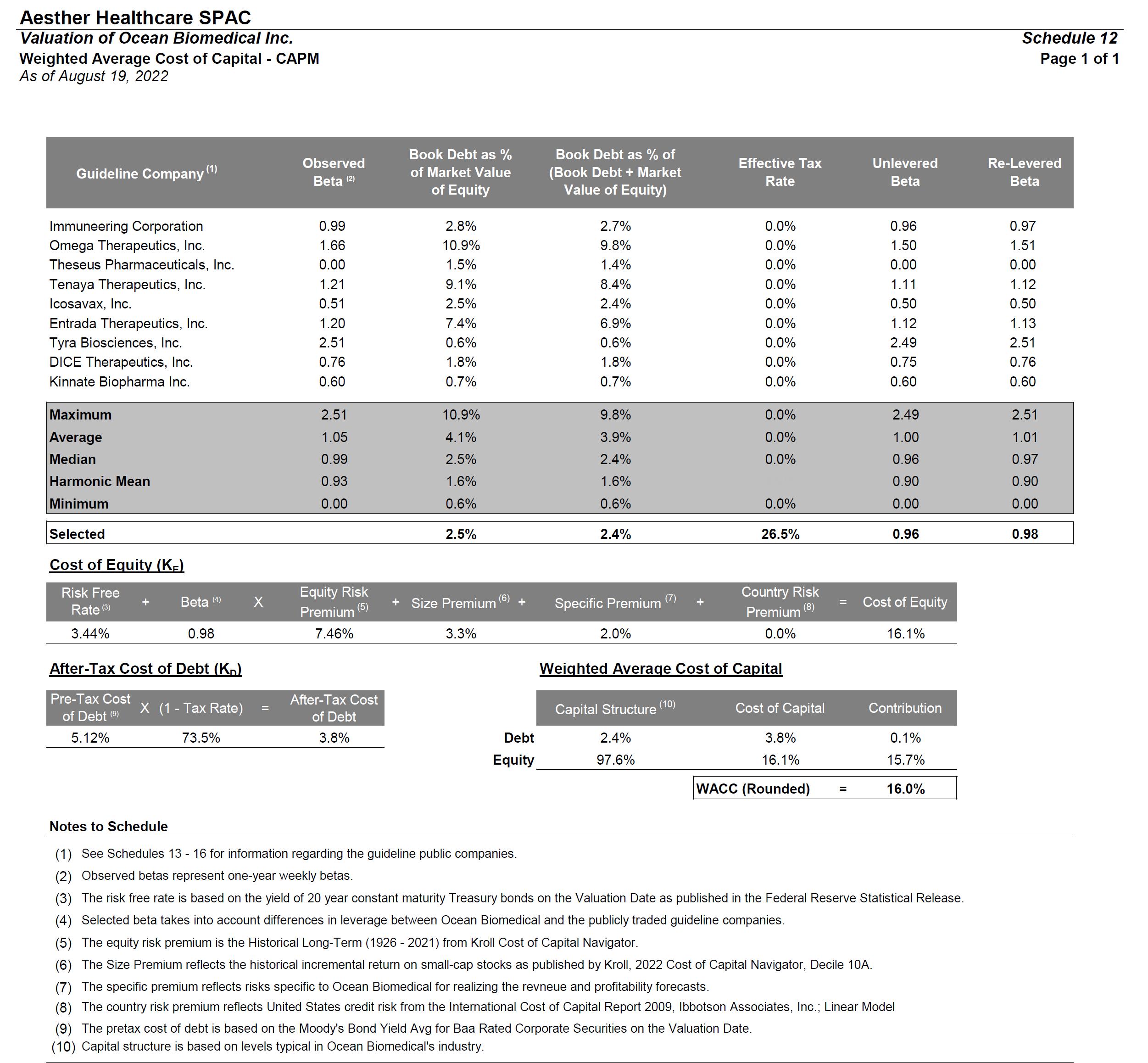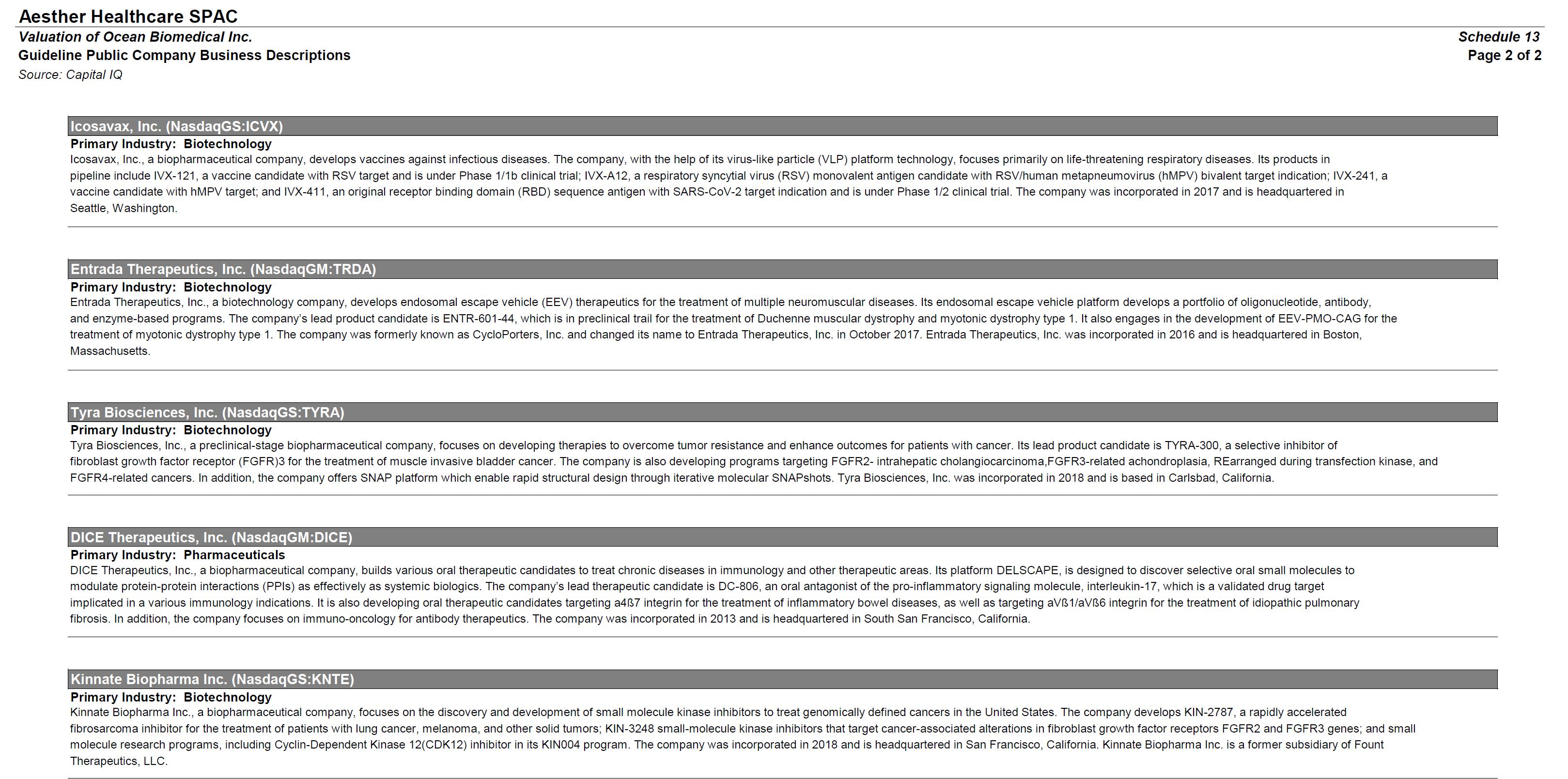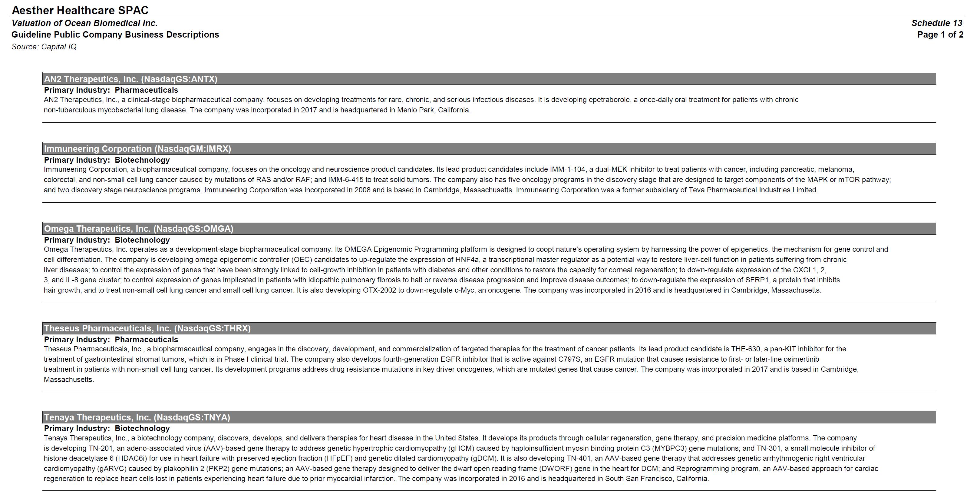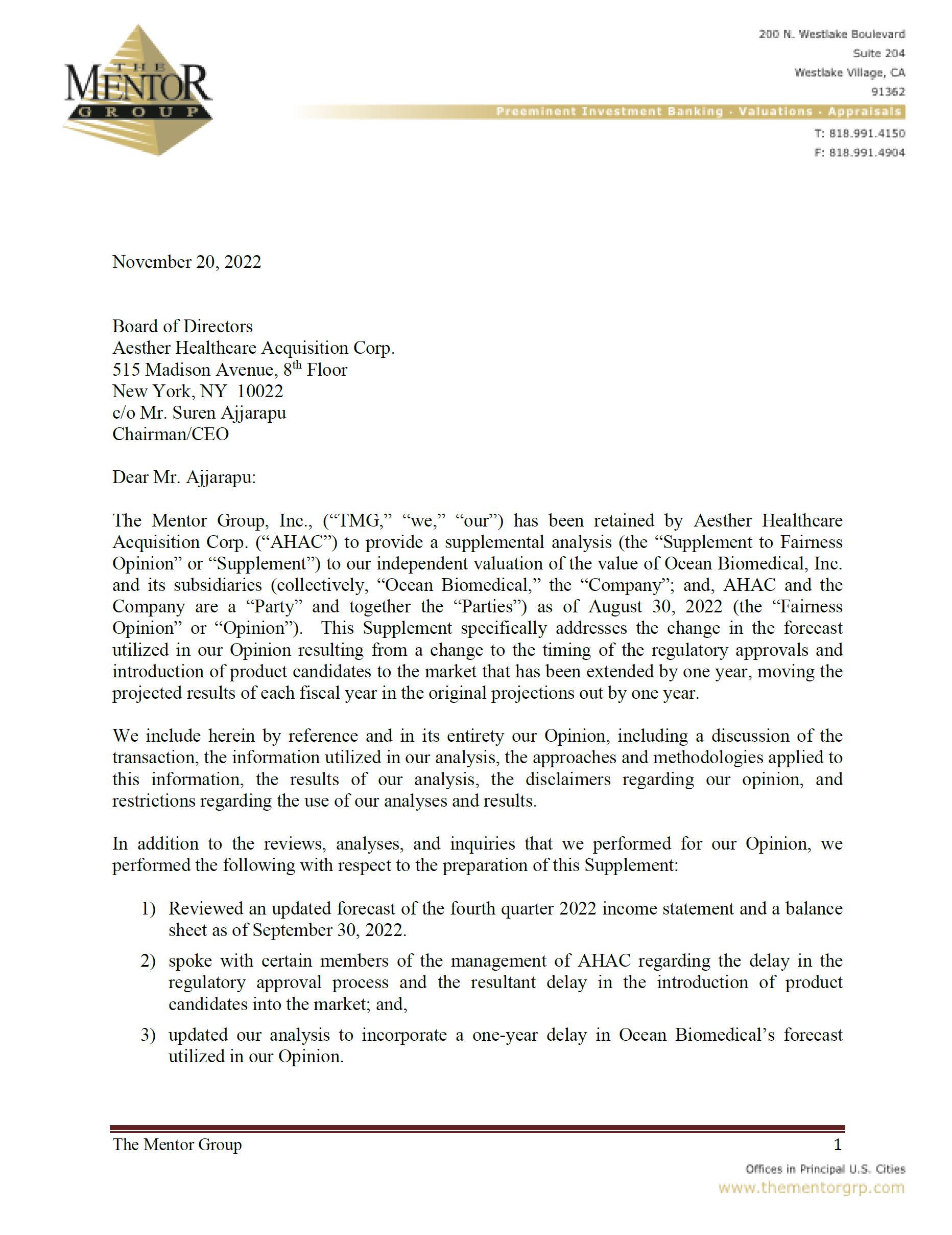 | (1) | The Business Combination Proposal — To adopt the Agreement and Plan of Merger, as amended, (the “Business Combination Agreement”), by and among AHAC Merger Sub Inc., a Delaware corporation and wholly-owned subsidiary of AHAC (“Merger Sub”), Ocean Biomedical, Inc., a Delaware corporation (“Ocean Biomedical”), Aesther Healthcare Sponsor, LLC, (“Sponsor”) in its capacity as Purchaser Representative, and Dr. Chirinjeev Kathuria, in his capacity as Seller Representative, pursuant to which at the closing of the transactions contemplated by the Business Combination Agreement (the “Closing”), Merger Sub will merge with and into Ocean Biomedical (the “Merger”), with Ocean Biomedical continuing as the surviving corporation and wholly-owned subsidiary of AHAC. |