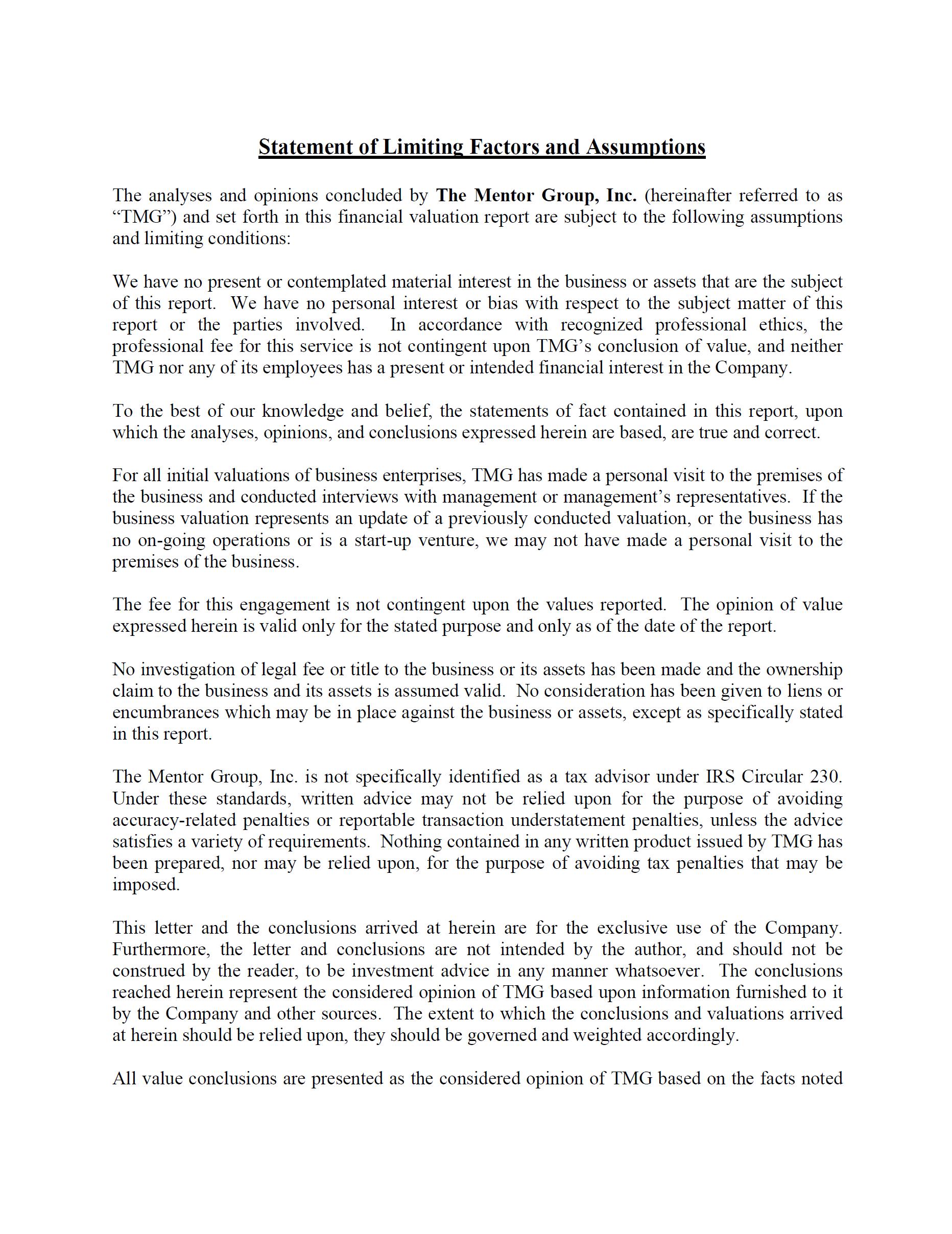 This letter and the conclusions arrived at herein are for the exclusive use of the Company. Furthermore, the letter and conclusions are not intended by the author, and should not be construed by the reader, to be investment advice in any manner whatsoever. The conclusions reached herein represent the considered opinion of TMG based upon information furnished to it by the Company and other sources. The extent to which the conclusions and valuations arrived at herein should be relied upon, they should be governed and weighted accordingly.