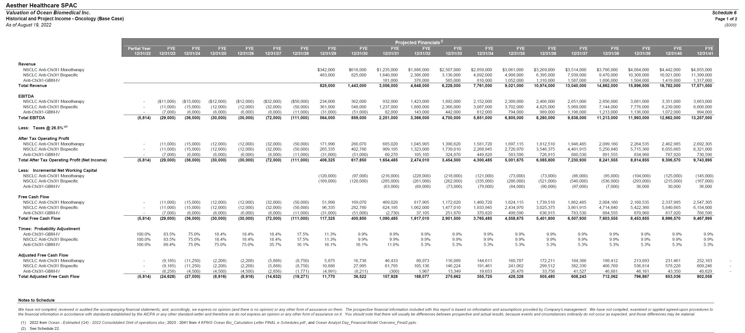 | Historical and Project Income - Oncology (Base Case) | Schedule 6 |