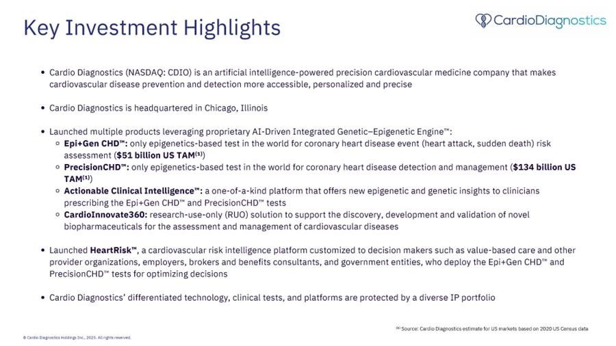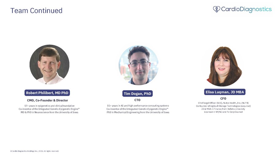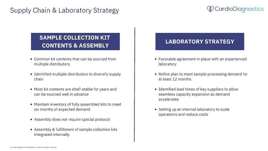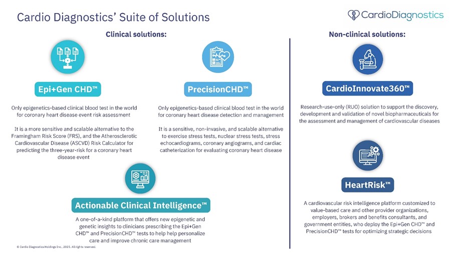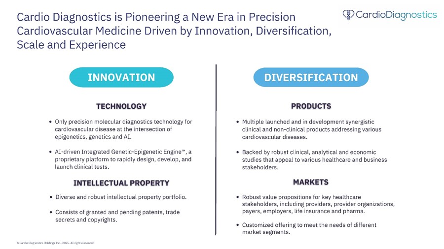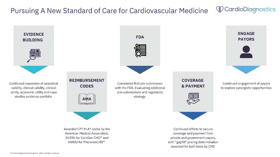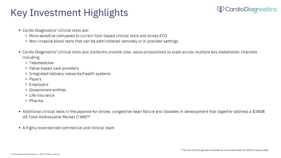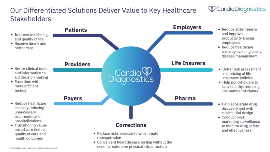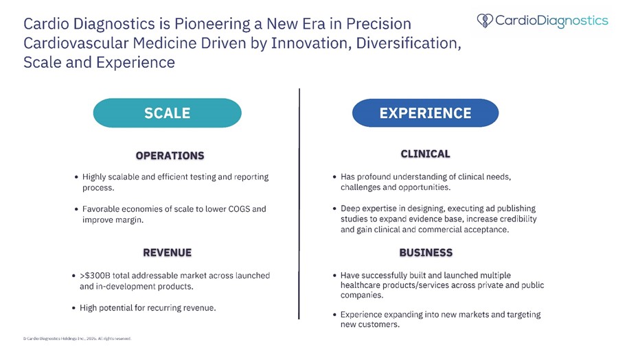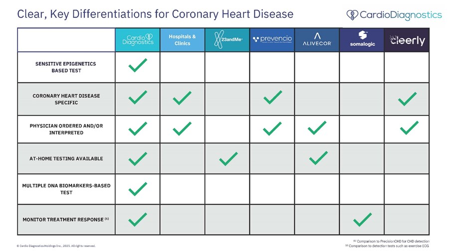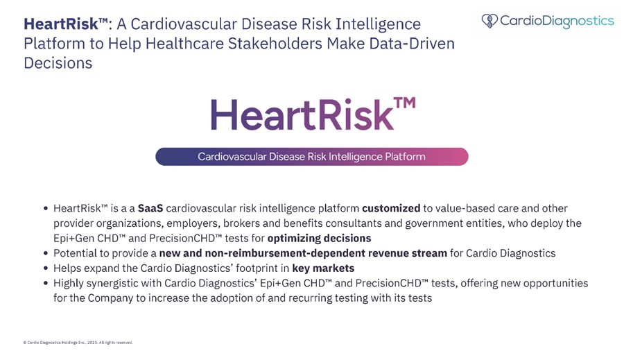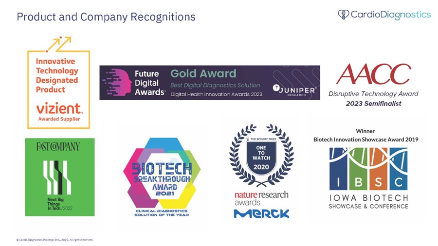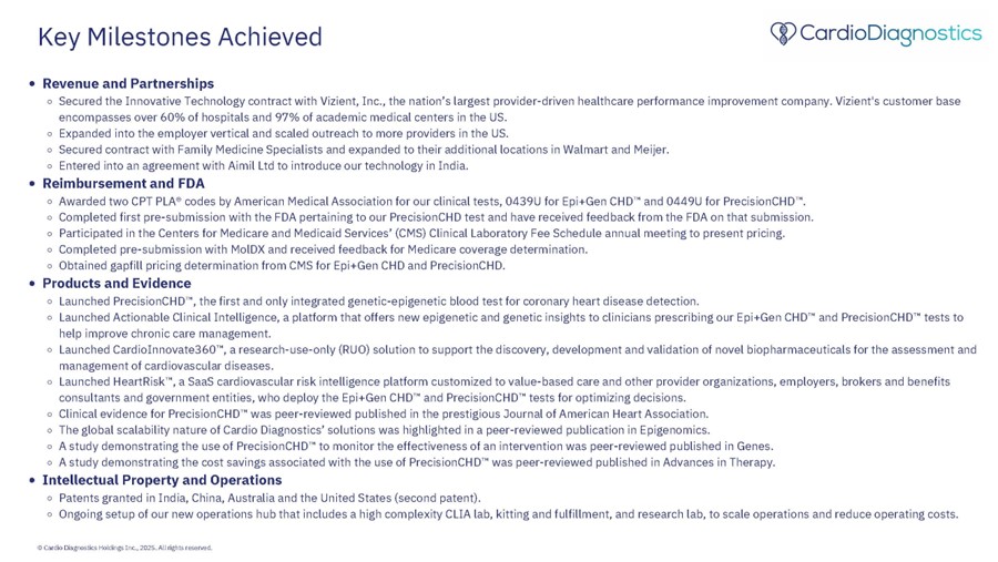 Selected Key Developments and Milestones © Cardio Diagnostics Holdings Inc., March 2024. All rights reserved. • Revenue and Partnerships ⚬ Secured the Innovative Technology contract with Vizient, Inc., the nation’s largest provider - driven healthcare performance impro vement company. As a result, Cardio Diagnostics is on contract with about 60% of hospitals and 97% of academic medical centers in the US. ⚬ Further expansion into the employer vertical. ⚬ Launched the Heart Attack Prevention Initiative with Family Medicine Specialists, a risk bearing provider. ⚬ Announced the expansion with Family Medicine Specialists to their Walmart location in Q2 2024 and Meijer location in Q3 2024. ⚬ Entered into an agreement with Aimil Ltd to introduce our technology in India. • Reimbursement and FDA ⚬ Awarded two CPT PLA® codes by American Medical Association for our clinical tests, 0439U for Epi+Gen CHD and 0449U for PrecisionCHD and went effective April 1st, 2024. ⚬ Completed first pre - submission with the FDA pertaining to our PrecisionCHD test and have received feedback from the FDA on that submission. ⚬ Participated in the Centers for Medicare and Medicaid Services’ (CMS) Clinical Laboratory Fee Schedule annual meeting to pres ent pricing. ⚬ Completed pre - submission with MolDX and received feedback for Medicare coverage determination. ⚬ Obtained gapfill pricing determination from CMS for Epi+Gen CHD and PrecisionCHD. • Products and Evidence ⚬ Launched PrecisionCHD , the first and only integrated genetic - epigenetic blood test for coronary heart disease detection and management. ⚬ Launched Actionable Clinical Intelligence, a platform that offers new epigenetic and genetic insights to clinicians prescribi ng our Epi+Gen CHD and PrecisionCHD tests to help improve chronic care management. ⚬ Launched CardioInnovate360 , a research - use - only (RUO) solution to support the discovery, development and validation of novel biopharmaceuticals for the as sessment and management of cardiovascular diseases. ⚬ Launched HeartRisk , a SaaS cardiovascular risk intelligence platform customized to value - based care and other provider organizations, employers, b rokers and benefits consultants and government entities, who deploy the Epi+Gen CHD and PrecisionCHD tests for optimizing decisions. ⚬ Clinical evidence for PrecisionCHD was peer - reviewed published in the prestigious Journal of American Heart Association journal. ⚬ The global scalability nature of Cardio Diagnostics’ solutions was highlighted in a peer - reviewed publication in Epigenomics. ⚬ A study demonstrating the use of PrecisionCHD to monitor the effectiveness of an intervention was peer - reviewed published in Genes. ⚬ A study demonstrating the cost savings associated with the use of PrecisionCHD was peer - reviewed published in Advances in Therapy. • Intellectual Property and Operations ⚬ Patents granted in India, China, Australia and the United States (second patent). ⚬ Started the setup of our new operations hub that includes a high complexity CLIA lab, kitting and fulfillment and research la b, to scale operations and reduce operating costs.