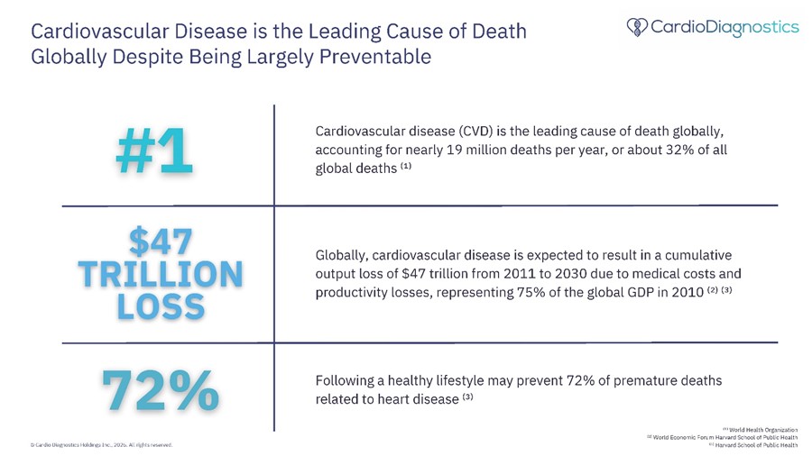 Cardiovascular disease (CVD) is the leading cause of death globally, accounting for nearly 19 million deaths per year, or about 32% of all global deaths ⁽ ¹ ⁾ Following a healthy lifestyle may prevent 72% of premature deaths related to heart disease ⁽ ³ ⁾ Globally, cardiovascular disease is expected to result in a cumulative output loss of $47 trillion from 2011 to 2030 due to medical costs and productivity losses, representing 75% of the global GDP in 2010 ⁽ ² ⁾ ⁽ ³ ⁾ $47 TRILLION LOSS 72% #1 Cardiovascular Disease is the Leading Cause of Death Globally Despite Being Largely Preventable ⁽ ¹ ⁾ World Health Organization ⁽ ² ⁾ World Economic Forum Harvard School of Public Health ⁽ ³ ⁾ Harvard School of Public Health © Cardio Diagnostics Holdings Inc., March 2024. All rights reserved.