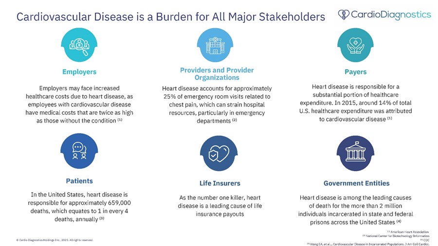 Cardiovascular Disease is a Burden for All Major Stakeholders Providers and Provider Organizations Employers Payers Heart disease accounts for approximately 25% of emergency room visits related to chest pain, which can strain hospital resources, particularly in emergency departments ⁽ ² ⁾ Employers may face increased healthcare costs due to heart disease, as employees with cardiovascular disease have medical costs that are twice as high as those without the condition ⁽ ¹ ⁾ Heart disease is responsible for a substantial portion of healthcare expenditure. In 2015, around 14% of total U.S. healthcare expenditure was attributed to cardiovascular disease ⁽ ¹ ⁾ ⁽ ¹ ⁾ American Heart Association ⁽ ² ⁾ National Center for Biotechnology Information ⁽ ³ ⁾ CDC ⁽ ⁴ ⁾ Wang EA, et al.,, Cardiovascular Disease in Incarcerated Populations. J Am Coll Cardiol. Patients Life Insurers In the United States, heart disease is responsible for approximately 659,000 deaths, which equates to 1 in every 4 deaths, annually ⁽ ³ ⁾ As the number one killer, heart disease is a leading cause of life insurance payouts © Cardio Diagnostics Holdings Inc., March 2024. All rights reserved. Government Entities Heart disease is among the leading causes of death for the more than 2 million individuals incarcerated in state and federal prisons across the United States ⁽ ⁴ ⁾