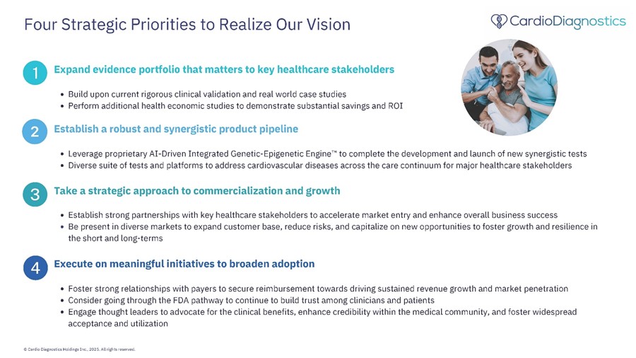 Four Strategic Priorities to Realize Our Vision Expand evidence portfolio that matters to key healthcare stakeholders • Build upon current rigorous clinical validation and real world case studies • Perform additional health economic studies to demonstrate substantial savings and ROI Establish a robust and synergistic product pipeline • Leverage proprietary AI - Driven Integrated Genetic - Epigenetic Engine to complete the development and launch of new synergistic tests • Diverse suite of tests and platforms to address cardiovascular diseases across the care continuum for major healthcare stakeh old ers Take a strategic approach to commercialization and growth • Establish strong partnerships with key healthcare stakeholders to accelerate market entry and enhance overall business succes s • Be present in diverse markets to expand customer base, reduce risks and capitalize on new opportunities to foster growth and res ilience in the short and long - terms Execute on meaningful initiatives to broaden adoption • Foster strong relationships with payers to secure reimbursement towards driving sustained revenue growth and market penetrati on • Consider going through the FDA pathway to continue to build trust among clinicians and patients • Engage thought leaders to advocate for the clinical benefits, enhance credibility within the medical community, and foster wi des pread acceptance and utilization © Cardio Diagnostics Holdings Inc., March 2024. All rights reserved.