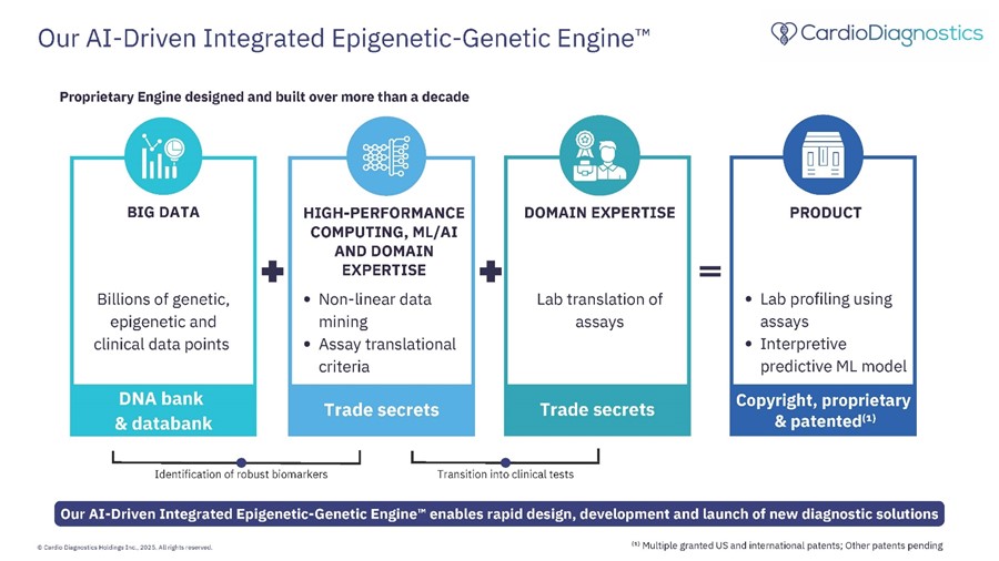 BIG DATA DNA bank & databank Billions of genetic, epigenetic & clinical data points HIGH - PERFORMANCE COMPUTING, ML/AI AND DOMAIN EXPERTISE Trade secrets • Non - linear data mining • Assay translational criteria DOMAIN EXPERTISE Trade secrets Lab translation of assays PRODUCT Copyright, proprietary & patented ⁽ ¹ ⁾ • Lab profiling using assays • Interpretive predictive ML model Proprietary Engine designed and built over more than a decade Our AI - Driven Integrated Epigenetic - Genetic Engine enables rapid design, development and launch of new diagnostic solutions Identification of robust biomarkers Transition into clinical tests ⁽ ¹ ⁾ Multiple granted US and international patents; Other patents pending Our AI - Driven Integrated Epigenetic - Genetic Engine © Cardio Diagnostics Holdings Inc., March 2024. All rights reserved.
