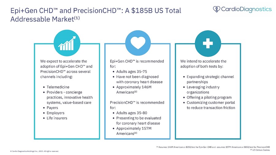 Epi+Gen CHD and PrecisionCHD : A $185B US Total Addressable Market ⁽ ¹ ⁾ Epi+Gen CHD is recommended for: • Adults ages 35 - 75 • Have not been diagnosed with coronary heart disease • Approximately 146M Americans ⁽ ² ⁾ PrecisionCHD is recommended for: • Adults ages 35 - 80 • Presenting to be evaluated for coronary heart disease • Approximately 157M Americans ⁽ ² ⁾ We expect to accelerate the adoption of Epi+Gen CHD and PrecisionCHD across several channels including: • Telemedicine • Providers - concierge practices, innovative health systems, value - based care • Payers • Employers • Life insurers We intend to accelerate the adoption of both tests by: • Expanding strategic channel partnerships • Leveraging industry organizations • Offering a piloting program • Customizing customer portal to reduce transaction friction ⁽ ¹ ⁾ Assumes 146M Americans x $350/test for Epi+Gen CHD and assumes 157M Americans x $850/test for PrecisionCHD ⁽ ² ⁾ US Census Bureau © Cardio Diagnostics Holdings Inc., March 2024. All rights reserved.