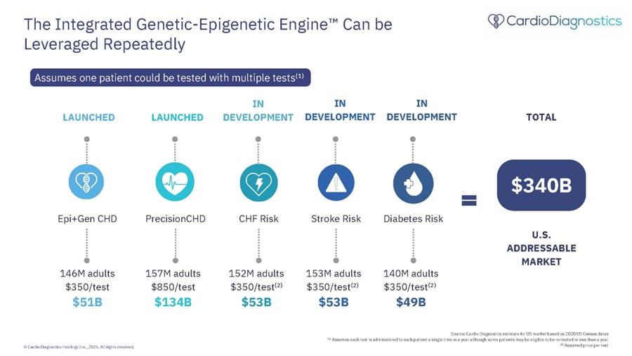 $340B by 2026* LAUNCHED Epi+Gen CHD 146M adults $350/test $51B LAUNCHED PrecisionCHD 157M adults $850/test $134B 2024/2025* CHF Risk 152M adults $350/test ⁽ ² ⁾ $53B 2024/2025* Stroke Risk 153M adults $350/test ⁽ ² ⁾ $53B 2025/2026* Diabetes Risk 140M adults $350/test ⁽ ² ⁾ $49B The Integrated Genetic - Epigenetic Engine Can be Leveraged Repeatedly Assumes one patient could be tested with multiple tests ⁽ ¹ ⁾ *Represents expected launch date Source: Cardio Diagnostics estimate for US market based on 2020 US Census datas ⁽ ¹ ⁾ Assumes each test is administered to each patient a single time in a year although some patients may be eligible to be re - teste d in less than a year ⁽ ² ⁾ Assumed price per test © Cardio Diagnostics Holdings Inc., March 2024. All rights reserved. TOTAL U.S. ADDRESSABLE MARKET