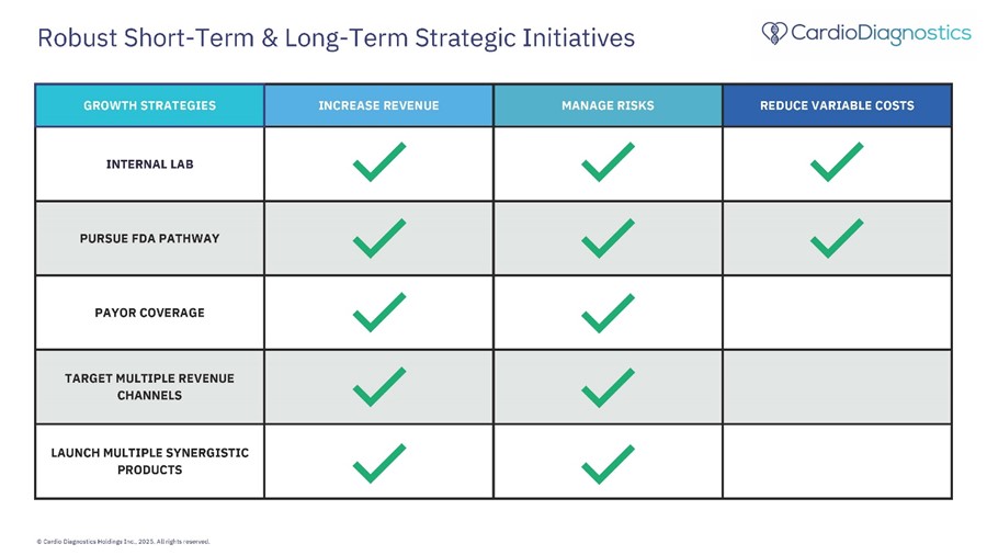 Robust Short - Term & Long - Term Strategic Initiatives REDUCE VARIABLE COSTS MANAGE RISKS INCREASE REVENUE GROWTH STRATEGIES INTERNAL LAB PURSUE FDA PATHWAY PAYOR COVERAGE TARGET MULTIPLE REVENUE CHANNELS LAUNCH MULTIPLE SYNERGISTIC PRODUCTS © Cardio Diagnostics Holdings Inc., March 2024. All rights reserved.