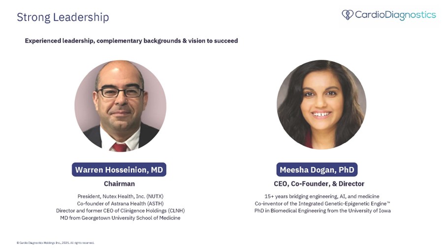 Strong Leadership Experienced leadership, complementary backgrounds & vision to succeed Warren Hosseinion, MD Meesha Dogan, PhD Chairman President, Nutex Health, Inc. (NUTX) - $78M market cap ⁽ ¹ ⁾ Co - founder of Astrana Health (ASTH) - $1.92B market cap ⁽ ¹ ⁾ Director and former CEO of Clinigence Holdings (CLNH) MD from Georgetown University School of Medicine CEO, Co - Founder, & Director 13+ years bridging engineering, AI, and medicine, Co - inventor of the Integrated Genetic - Epigenetic Engine PhD in Biomedical Engineering from the University of Iowa ⁽ ¹ ⁾ As of 3/22/24 © Cardio Diagnostics Holdings Inc., March 2024. All rights reserved.
