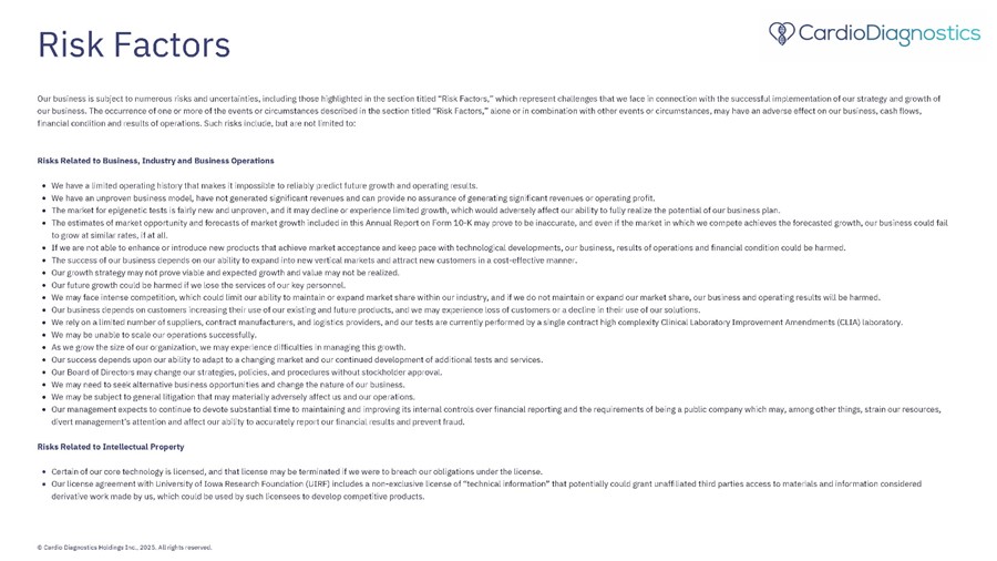 Our business is subject to numerous risks and uncertainties, including those highlighted in the section titled “Risk Factors, ” w hich represent challenges that we face in connection with the successful implementation of our strategy and growth of our business. The occurrence of one or more of the events or circumstances described in the section titled “Risk Factors,” al one or in combination with other events or circumstances, may have an adverse effect on our business, cash flows, financial condition and results of operations. Such risks include, but are not limited to: Risks Related to Business, Industry and Business Operations • We have a limited operating history that makes it impossible to reliably predict future growth and operating results. • We have an unproven business model, have not generated significant revenues and can provide no assurance of generating signif ica nt revenues or operating profit. • The market for epigenetic tests is fairly new and unproven, and it may decline or experience limited growth, which would adve rse ly affect our ability to fully realize the potential of our business plan. • The estimates of market opportunity and forecasts of market growth included in this Annual Report on Form 10 - K may prove to be i naccurate, and even if the market in which we compete achieves the forecasted growth, our business could fail to grow at similar rates, if at all. • If we are not able to enhance or introduce new products that achieve market acceptance and keep pace with technological devel opm ents, our business, results of operations and financial condition could be harmed. • The success of our business depends on our ability to expand into new vertical markets and attract new customers in a cost - effec tive manner. • Our growth strategy may not prove viable and expected growth and value may not be realized. • Our future growth could be harmed if we lose the services of our key personnel. • We may face intense competition, which could limit our ability to maintain or expand market share within our industry, and if we do not maintain or expand our market share, our business and operating results will be harmed. • Our business depends on customers increasing their use of our existing and future products, and we may experience loss of cus tom ers or a decline in their use of our solutions. • We rely on a limited number of suppliers, contract manufacturers, and logistics providers, and our tests are currently perfor med by a single contract high complexity Clinical Laboratory Improvement Amendments (CLIA) laboratory. • We may be unable to scale our operations successfully. • As we grow the size of our organization, we may experience difficulties in managing this growth. • Our success depends upon our ability to adapt to a changing market and our continued development of additional tests and serv ice s. • Our Board of Directors may change our strategies, policies, and procedures without stockholder approval. • We may need to seek alternative business opportunities and change the nature of our business. • We may be subject to general litigation that may materially adversely affect us and our operations. • Our management expects to continue to devote substantial time to maintaining and improving its internal controls over financi al reporting and the requirements of being a public company which may, among other things, strain our resources, divert management’s attention and affect our ability to accurately report our financial results and prevent fraud. Risks Related to Intellectual Property • Certain of our core technology is licensed, and that license may be terminated if we were to breach our obligations under the li cense. • Our license agreement with University of Iowa Research Foundation (UIRF) includes a non - exclusive license of “technical informat ion” that potentially could grant unaffiliated third parties access to materials and information considered derivative work made by us, which could be used by such licensees to develop competitive products. Risk Factors © Cardio Diagnostics Holdings Inc., March 2024. All rights reserved.