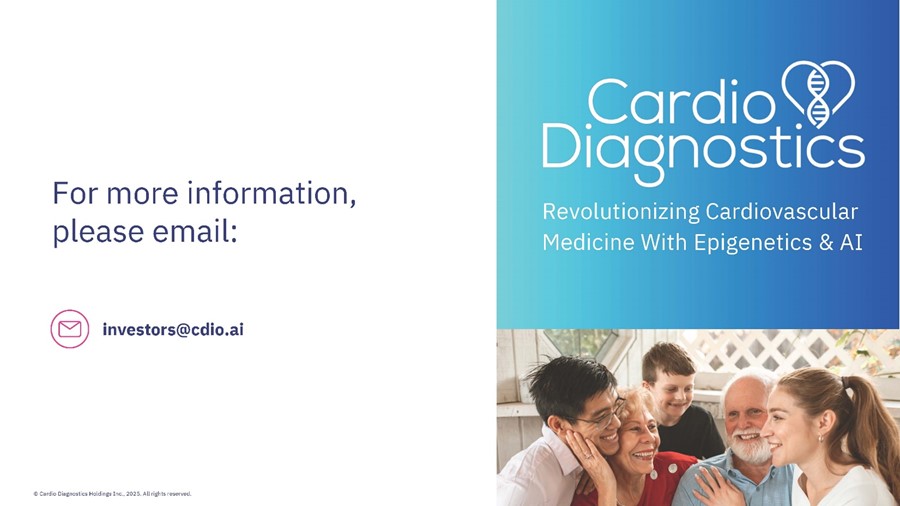 For more information, please email: investors@cardiodiagnosticsinc.com Revolutionizing Cardiovascular Medicine With Epigenetics & AI © Cardio Diagnostics Holdings Inc., March 2024. All rights reserved.