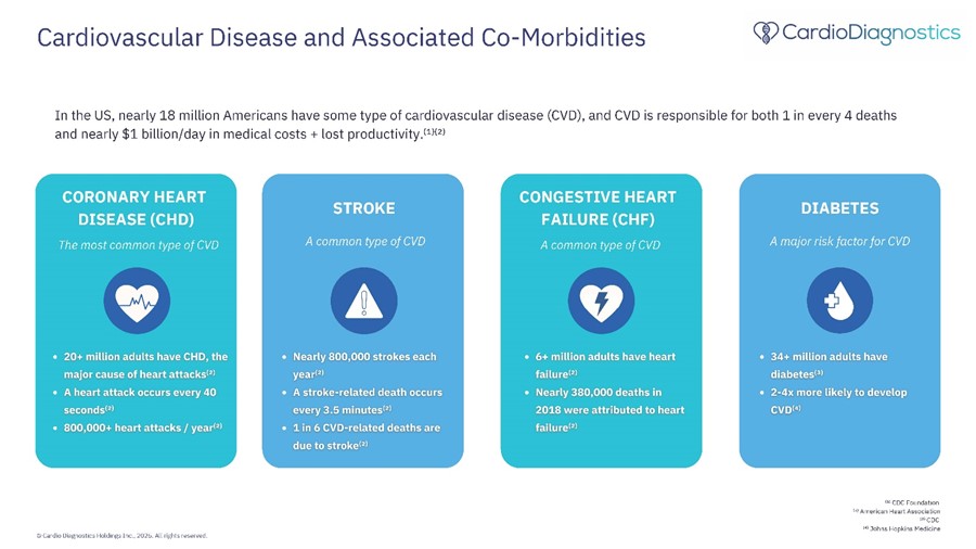 In the US, nearly 18 million Americans have some type of cardiovascular disease (CVD), and CVD is responsible for both 1 in e ver y 4 deaths and nearly $1 billion/day in medical costs + lost productivity. ⁽ ¹ ⁾⁽ ² ⁾ CORONARY HEART DISEASE (CHD) • 20+ million adults have CHD, the major cause of heart attacks ⁽ ² ⁾ • A heart attack occurs every 40 seconds ⁽ ² ⁾ • 800,000+ heart attacks / year ⁽ ² ⁾ The most common type of CVD STROKE • Nearly 800,000 strokes each year ⁽ ² ⁾ • A stroke - related death occurs every 3.5 minutes ⁽ ² ⁾ • 1 in 6 CVD - related deaths are due to stroke ⁽ ² ⁾ A common type of CVD CONGESTIVE HEART FAILURE (CHF) • 6+ million adults have heart failure ⁽ ² ⁾ • Nearly 380,000 deaths in 2018 were attributed to heart failure ⁽ ² ⁾ A common type of CVD DIABETES • 34+ million adults have diabetes ⁽ ³ ⁾ • 2 - 4x more likely to develop CVD ⁽ ⁴ ⁾ A major risk factor for CVD ⁽ ¹ ⁾ CDC Foundation ⁽ ² ⁾ American Heart Association ⁽ ³ ⁾ CDC ⁽ ⁴ ⁾ Johns Hopkins Medicine Cardiovascular Disease and Associated Co - Morbidities © Cardio Diagnostics Holdings Inc., March 2024. All rights reserved.