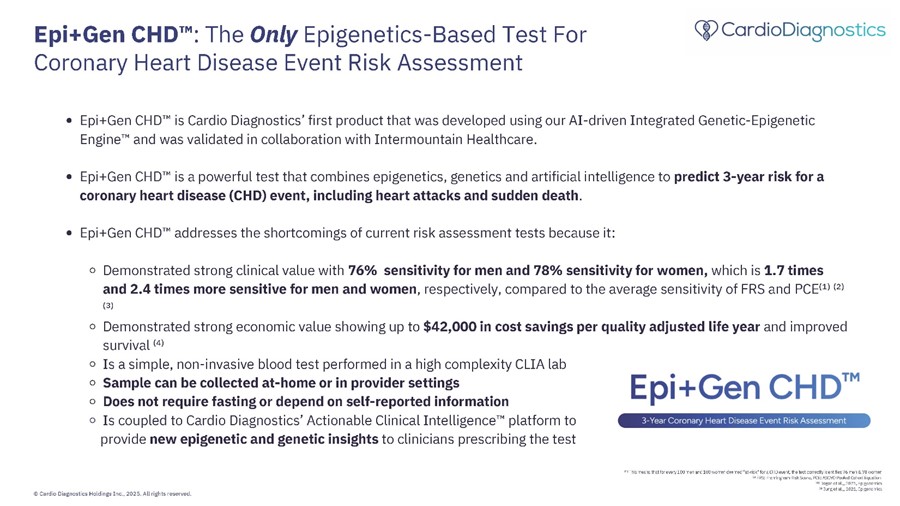 • Epi+Gen CHD is Cardio Diagnostics’ first product that was developed using our AI - driven Integrated Genetic - Epigenetic Engine and was validated in collaboration with Intermountain Healthcare. • Epi+Gen CHD is a powerful test that combines epigenetics, genetics and artificial intelligence to predict 3 - year risk for coronary heart disease (CHD), the most common type of heart disease and the major cause of heart attacks. • Epi+Gen CHD addresses the shortcomings of current risk assessment tests because it: ⚬ Demonstrated strong clinical value with 76% sensitivity for men and 78% sensitivity for women, which is 1.7 times and 2.4 times more sensitive for men and women , respectively, compared to the average sensitivity of FRS and PCE ⁽ ¹ ⁾ ⁽ ² ⁾ ⁽ ³ ⁾ ⚬ Demonstrated strong economic value showing up to $42,000 in cost savings per quality adjusted life year and improved survival ⁽ ⁴ ⁾ ⚬ Is a simple, non - invasive blood test performed in a high complexity CLIA lab ⚬ Sample can be collected at - home or in provider settings ⚬ Does not require fasting or depend on self - reported information ⚬ Is coupled to Cardio Diagnostics’ Actionable Clinical Intelligence platform to ........... provide new epigenetic and genetic insights to clinicians prescribing the test Epi+Gen CHD : The Only Epigenetics - Based Test For Coronary Heart Disease Risk Assessment ⁽ ¹ ⁾ This means that for every 100 men and 100 women deemed “at - risk” for a CHD event, the test correctly identifies 76 men & 78 wom en ⁽ ² ⁾ FRS: Framingham Risk Score, PCE: ASCVD Pooled Cohort Equation ⁽ ³ ⁾ Dogan et al.,, 2021, Epigenomics ⁽ ⁴ ⁾ Jung et al.,, 2021, Epigenomics © Cardio Diagnostics Holdings Inc., March 2024. All rights reserved.