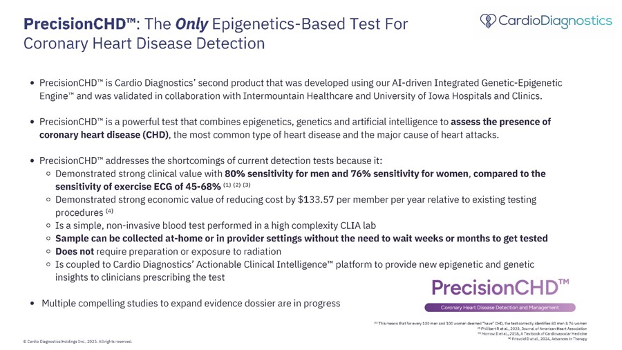 • PrecisionCHD is Cardio Diagnostics’ second product that was developed using our AI - driven Integrated Genetic - Epigenetic Engine and was validated in collaboration with Intermountain Healthcare and University of Iowa Hospitals and Clinics. • PrecisionCHD is a powerful test that combines epigenetics, genetics and artificial intelligence to assess the presence of coronary heart disease (CHD), the most common type of heart disease and the major cause of heart attacks. • PrecisionCHD addresses the shortcomings of current detection tests because it: ⚬ Demonstrated strong clinical value with 80% sensitivity for men and 76% sensitivity for women , compared to the sensitivity of exercise ECG of 45 - 68% ⁽ ¹ ⁾ ⁽ ² ⁾ ⁽ ³ ⁾ ⚬ Is a simple, non - invasive blood test performed in a high complexity CLIA lab ⚬ Sample can be collected at - home or in provider settings without the need to wait weeks or months to get tested ⚬ Does not require preparation or exposure to radiation ⚬ Is coupled to Cardio Diagnostics’ Actionable Clinical Intelligence platform to provide new epigenetic and genetic insights to clinicians prescribing the test • Multiple compelling clinical and economic studies to expand evidence dossier ........ are in progress PrecisionCHD : The Only Epigenetics - Based Test For Coronary Heart Disease Detection ⁽ ¹ ⁾ This means that for every 100 men and 100 women deemed “have” CHD, the test correctly identifies 80 men & 76 women ⁽ ² ⁾ Philibert R et al.,, 2023, Journal of American Heart Association ⁽ ³ ⁾ Morrow D et al.,, 2018, A Textbook of Cardiovascular Medicine © Cardio Diagnostics Holdings Inc., March 2024. All rights reserved.