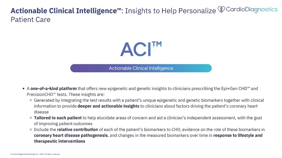• A one - of - a - kind platform that offers new epigenetic and genetic insights to clinicians prescribing the Epi+Gen CHD and PrecisionCHD tests. These insights are: ⚬ Generated by integrating the test results with a patient’s unique epigenetic and genetic biomarkers together with clinical information to provide deeper and actionable insights to clinicians about factors driving the patient’s coronary heart disease ⚬ Are tailored to each patient to help elucidate areas of concern and aid a clinician’s independent assessment, with the goal of improving patient outcomes ⚬ Include the relative contribution of each of the patient’s biomarkers to CHD, evidence on the role of these biomarkers in coronary heart disease pathogenesis , and changes in the measured biomarkers over time in response to lifestyle and therapeutic interventions Actionable Clinical Intelligence : Assisting Clinicians in Personalizing Clinical Decision Making © Cardio Diagnostics Holdings Inc., March 2024. All rights reserved.