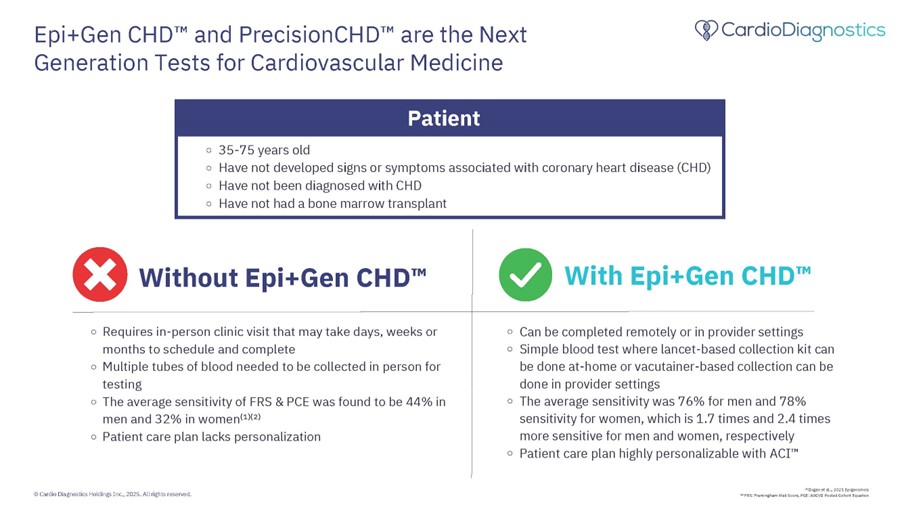⚬ Can be completed remotely or in provider settings ⚬ Simple blood test where lancet - based collection kit can be done at - home or vacutainer - based collection can be done in provider settings ⚬ The average sensitivity was 76% for men and 78% sensitivity for women, which is 1.7 times and 2.4 times more sensitive for men and women, respectively ⚬ Patient care plan highly personalizable with ACI Patient ⚬ 35 - 75 years old ⚬ Have not developed signs or symptoms associated with coronary heart disease (CHD) ⚬ Have not been diagnosed with CHD ⚬ Have not had a bone marrow transplant Epi+Gen CHD and PrecisionCHD are the Next Generation Tests for Cardiovascular Medicine Without Epi+Gen CHD With Epi+Gen CHD ⚬ Requires in - person clinic visit that may take days, weeks or months to complete ⚬ Multiple tubes of blood needed to be collected in person for testing ⚬ The average sensitivity of FRS & PCE was found to be 44% in men and 32% in women ⁽ ¹ ⁾⁽ ² ⁾ ⚬ Patient care plan lacks personalization ⁽ ¹ ⁾ Dogan et al.,, 2021 Epigenomics ⁽ ² ⁾ FRS: Framingham Risk Score, PCE: ASCVD Pooled Cohort Equation © Cardio Diagnostics Holdings Inc., March 2024. All rights reserved.