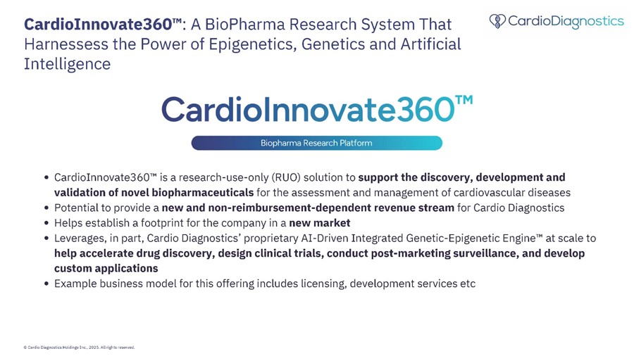 CardioInnovate360 : A BioPharma Research System That Harnessess the Power of Epigenetics, Genetics and Artificial Intelligence • CardioInnovate360 is a research - use - only (RUO) solution to support the discovery, development and validation of novel biopharmaceuticals for the assessment and management of cardiovascular diseases • Potential to provide a new and non - reimbursement - dependent revenue stream for Cardio Diagnostics • Helps establish a footprint for the company in a new market • Leverages, in part, Cardio Diagnostics’ proprietary AI - Driven Integrated Genetic - Epigenetic Engine at scale to help accelerate drug discovery, design clinical trials, conduct post - marketing surveillance, and develop custom applications • Example business model for this offering includes licensing, development services etc © Cardio Diagnostics Holdings Inc., March 2024. All rights reserved.