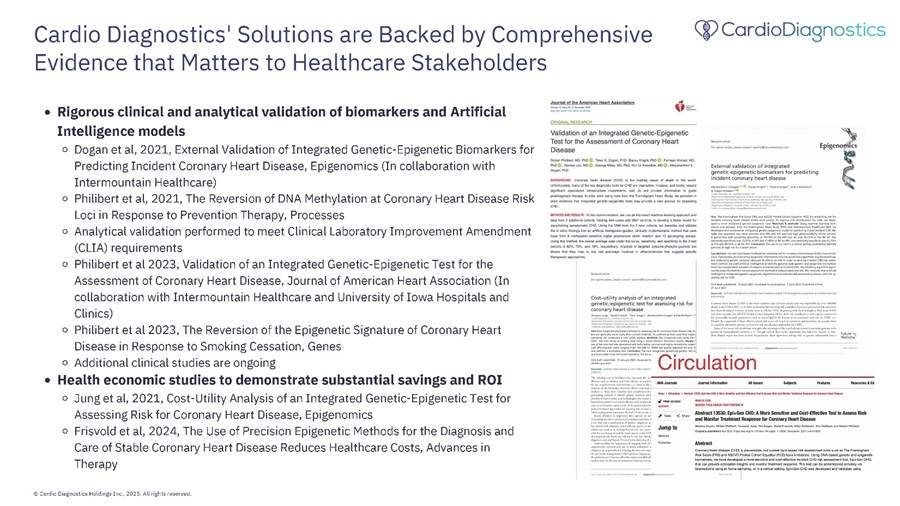 Cardio Diagnostics' Solutions are Backed by Comprehensive Evidence that Matters to Healthcare Stakeholders • Rigorous clinical and analytical validation of biomarkers and Artificial Intelligence models ⚬ Dogan et al, 2021, External Validation of Integrated Genetic - Epigenetic Biomarkers for Predicting Incident Coronary Heart Disease, Epigenomics (In collaboration with Intermountain Healthcare) ⚬ Philibert et al, 2021, The Reversion of DNA Methylation at Coronary Heart Disease Risk Loci in Response to Prevention Therapy, Processes ⚬ Analytical validation performed to meet Clinical Laboratory Improvement Amendment (CLIA) requirements ⚬ Philibert et al 2023, Validation of an Integrated Genetic - Epigenetic Test for the Assessment of Coronary Heart Disease, Journal of American Heart Association (In collaboration with Intermountain Healthcare and University of Iowa Hospitals and Clinics) ⚬ Philibert et al 2023, The Reversion of the Epigenetic Signature of Coronary Heart Disease in Response to Smoking Cessation, Genes ⚬ Additional clinical studies are ongoing • Health economic studies to demonstrate substantial savings and ROI ⚬ Jung et al, 2021, Cost - Utility Analysis of an Integrated Genetic - Epigenetic Test for Assessing Risk for Coronary Heart Disease, Epigenomics ⚬ Additional health economic studies are ongoing © Cardio Diagnostics Holdings Inc., March 2024. All rights reserved.