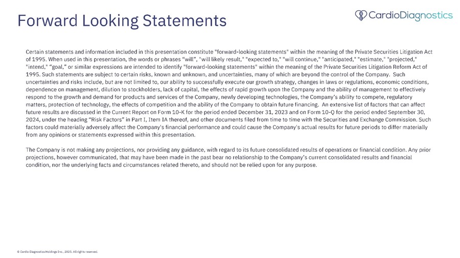 Certain statements and information included in this presentation constitute "forward - looking statements" within the meaning of t he Private Securities Litigation Act of 1995. When used in this presentation, the words or phrases “will”, "will likely result," "expected to," "will continue," " ant icipated," "estimate," "projected," "intend," “goal,” or similar expressions are intended to identify "forward - looking statements" within the meaning of the Private Securities Litigation Reform Act of 1995. Such statements are subject to certain risks, known and unknown, and uncertainties, many of which are beyond the contro l o f the Company. Such uncertainties and risks include, but are not limited to, our ability to successfully execute our growth strategy, changes in law s or regulations, economic conditions, dependence on management, dilution to stockholders, lack of capital, the effects of rapid growth upon the Company and the abi lit y of management to effectively respond to the growth and demand for products and services of the Company, newly developing technologies, the Company’s abili ty to compete, regulatory matters, protection of technology, the effects of competition and the ability of the Company to obtain future financing. An ext ensive list of factors that can affect future results are discussed in the Current Report on Form 10 - K for the period ended December 31, 2023 under the heading “Risk F actors” in Part I, Item IA thereof, and other documents filed from time to time with the Securities and Exchange Commission. Such factors could material ly adversely affect the Company's financial performance and could cause the Company's actual results for future periods to differ materially from any opinions or statements expressed within this presentation. The Company is not making any projections, nor providing any guidance, with regard to its future consolidated results of oper ati ons or financial condition. Any prior projections, however communicated, that may have been made in the past bear no relationship to the Company’s current consolid ate d results and financial condition, nor the underlying facts and circumstances related thereto, and should not be relied upon for any purpose. Forward Looking Statements © Cardio Diagnostics Holdings Inc., March 2024. All rights reserved.