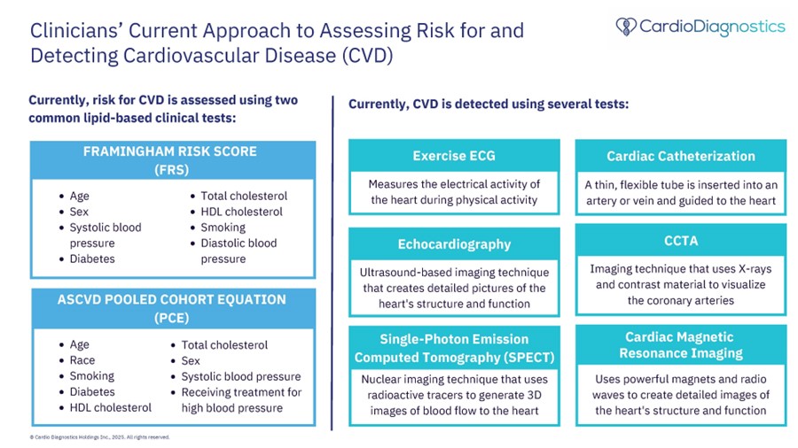Clinicians’ Current Approach to Assessing Risk for and Detecting Cardiovascular Disease Currently, risk for CVD is assessed using two common lipid - based clinical tests: FRAMINGHAM RISK SCORE (FRS) • Age • Gender • Systolic blood pressure • Diabetes • Total cholesterol • HDL cholesterol • Smoking • Diastolic blood pressure ASCVD POOLED COHORT EQUATION (PCE) • Age • Race • Smoking • Diabetes • HDL cholesterol • Total cholesterol • Gender • Systolic blood pressure • Receiving treatment for high blood pressure Exercise ECG Measures the electrical activity of the heart during physical activity Currently, CVD is detected using several tests: Echocardiography Ultrasound - based imaging technique that creates detailed pictures of the heart's structure and function Single - Photon Emission Computed Tomography (SPECT) Nuclear imaging technique that uses radioactive tracers to generate 3D images of blood flow to the heart Cardiac Magnetic Resonance Imaging Uses powerful magnets and radio waves to create detailed images of the heart's structure and function CCTA Imaging technique that uses X - rays and contrast material to visualize the coronary arteries Cardiac Catheterization A thin, flexible tube is inserted into an artery or vein and guided to the heart © Cardio Diagnostics Holdings Inc., March 2024. All rights reserved.