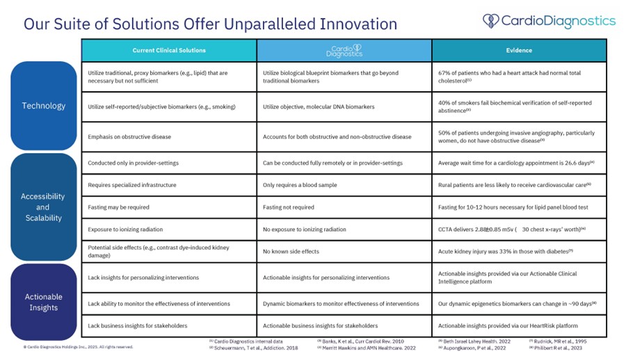 Our Suite of Solutions Offer Unparalleled Innovation Evidence Current Clinical Solutions 67% of patients who had a heart attack had normal total cholesterol ⁽ ¹ ⁾ Utilize biological blueprint biomarkers that go beyond traditional biomarkers Utilize traditional biomarkers (e.g., lipid) that are necessary but not sufficient 40% of smokers fail biochemical verification of self - reported abstinence ⁽ ² ⁾ Utilize objective, molecular DNA biomarkers Utilize self - reported/subjective biomarkers (e.g., smoking) 50% of patients undergoing invasive angiography, particularly women, do not have obstructive disease ⁽ ³ ⁾ Accounts for both obstructive and non - obstructive disease Emphasis on obstructive disease Average wait time for a cardiology appointment is 26.6 days ⁽ ⁴ ⁾ Can be conducted fully remotely or in provider - settings Conducted only in provider - settings Rural patients are less likely to receive cardiovascular care ⁽ ⁵ ⁾ Only requires a blood sample Requires specialized infrastructure Fasting for 10 - 12 hours necessary for lipid panel blood test Fasting not required Fasting may be required CCTA delivers 2.88 0.85 mSv ( ∼ 30 chest x - rays’ worth) ⁽ ⁶ ⁾ No exposure to ionizing radiation Exposure to ionizing radiation Acute kidney injury was 33% in those with diabetes ⁽ ⁷ ⁾ No known side effects Potential side effects (e.g., contrast dye - induced kidney damage) Actionable insights provided via our Actionable Clinical Intelligence platform Actionable insights for personalizing interventions Lack insights for personalizing interventions Our dynamic epigenetics biomarkers can change in ~90 days ⁽ ⁸ ⁾ Dynamic biomarkers to monitor effectiveness of interventions Lack ability to monitor the effectiveness of interventions Actionable insights provided via our HeartRisk platform Actionable business insights for stakeholders Lack business insights for stakeholders Technology Accessibility and Scalability Actionable Insights © Cardio Diagnostics Holdings Inc., March 2024. All rights reserved. ⁽ ¹ ⁾ Cardio Diagnostics internal data ⁽ ² ⁾ Scheuermann, T et al . , Addiction . 2018 ⁽ ³ ⁾ Banks, K et al . , Curr Cardiol Rev . 2010 ⁽ ⁴ ⁾ Merritt Hawkins and AMN Healthcare . 2022 ⁽ ⁵ ⁾ Beth Israel Lahey Health . 2022 ⁽ ⁶ ⁾ Aupongkaroon, P et al . , 2022 ⁽ ⁷ ⁾ Rudnick, MR et al . , 1995 ⁽ ⁸ ⁾ Philibert R et al . , 2023