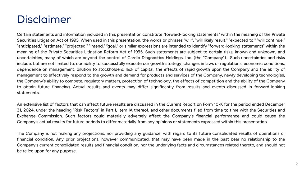 Certain statements and information included in this presentation constitute "forward - looking statements" within the meaning of the Private Securities Litigation Act of 1995 . When used in this presentation, the words or phrases “will”, "will likely result," "expected to," "will continue," "anticipated," "estimate," "projected," "intend," “goal,” or similar expressions are intended to identify "forward - looking statements" within the meaning of the Private Securities Litigation Reform Act of 1995 . Such statements are subject to certain risks, known and unknown, and uncertainties, many of which are beyond the control of Cardio Diagnostics Holdings, Inc . (the “Company”) . Such uncertainties and risks include, but are not limited to, our ability to successfully execute our growth strategy, changes in laws or regulations, economic conditions, dependence on management, dilution to stockholders, lack of capital, the effects of rapid growth upon the Company and the ability of management to effectively respond to the growth and demand for products and services of the Company, newly developing technologies, the Company’s ability to compete, regulatory matters, protection of technology, the effects of competition and the ability of the Company to obtain future financing . Actual results and events may differ significantly from results and events discussed in forward - looking statements . An extensive list of factors that can affect future results are discussed in the Current Report on Form 10 - K for the period ended December 31 , 2024 , under the heading “Risk Factors” in Part I, Item IA thereof, and other documents filed from time to time with the Securities and Exchange Commission . Such factors could materially adversely affect the Company's financial performance and could cause the Company's actual results for future periods to differ materially from any opinions or statements expressed within this presentation . The Company is not making any projections, nor providing any guidance, with regard to its future consolidated results of operations or financial condition . Any prior projections, however communicated, that may have been made in the past bear no relationship to the Company’s current consolidated results and financial condition, nor the underlying facts and circumstances related thereto, and should not be relied upon for any purpose . Disclaimer 2