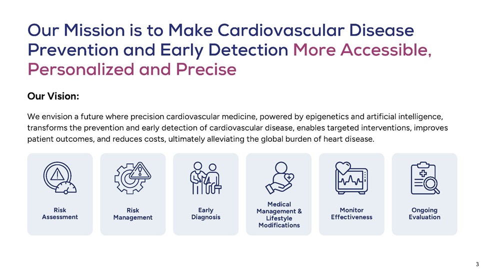 Risk Assessment Early Diagnosis Risk Management Medical Management & Lifestyle Modifications Monitor Effectiveness Ongoing Evaluation Our Vision: Our Mission is to Make Cardiovascular Disease Prevention and Early Detection More Accessible, Personalized and Precise We envision a future where precision cardiovascular medicine, powered by epigenetics and artificial intelligence, transforms the prevention and early detection of cardiovascular disease, enables targeted interventions, improves patient outcomes, and reduces costs, ultimately alleviating the global burden of heart disease. 3