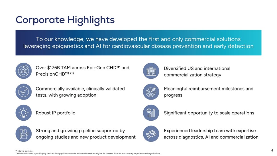 To our knowledge, we have developed the first and only commercial solutions leveraging epigenetics and AI for cardiovascular disease prevention and early detection Over $176B TAM across Epi+Gen CHD and PrecisionCHD ⁽ ¹ ⁾ Commercially available, clinically validated tests, with growing adoption Strong and growing pipeline supported by ongoing studies and new product development Robust IP portfolio Diversified US and international commercialization strategy Meaningful reimbursement milestones and progress Experienced leadership team with expertise across diagnostics, AI and commercialization Significant opportunity to scale operations Corporate Highlights 4 ⁽ ¹ ⁾ Internal estimate TAM was calculated by multiplying the CMS final gapfill rate with the estimated Americans eligible for the test. Price for te st can vary for patients and organizations.