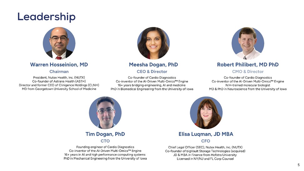 Chairman President, Nutex Health, Inc. (NUTX) Co - founder of Astrana Health (ASTH) Director and former CEO of Clinigence Holdings (CLNH) MD from Georgetown University School of Medicine Warren Hosseinion, MD Leadership CEO & Director Co - founder of Cardio Diagnostics Co - inventor of the AI - Driven Multi - Omics Engine 16+ years bridging engineering, AI and medicine PhD in Biomedical Engineering from the University of Iowa Meesha Dogan, PhD CMO & Director Co - founder of Cardio Diagnostics Co - inventor of the AI - Driven Multi - Omics Engine NIH - trained molecular biologist MD & PhD in Neuroscience from the University of Iowa Robert Philibert, MD PhD CFO Chief Legal Officer (SEC), Nutex Health, Inc. (NUTX) Co - founder of bigVault Storage Technologies (acquired) JD & MBA in Finance from Hofstra University Licensed in NY/NJ and FL Corp Counsel Elisa Luqman, JD MBA CTO Founding engineer of Cardio Diagnostics Co - inventor of the AI - Driven Multi - Omics Engine 16+ years in AI and high performance computing systems PhD in Mechanical Engineering from the University of Iowa Tim Dogan, PhD 5