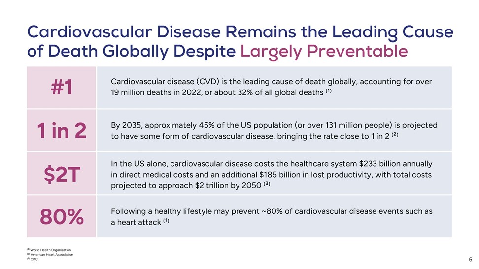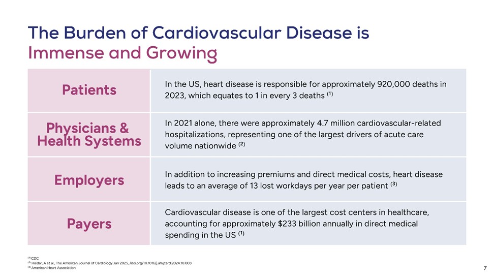 ⁽ ¹ ⁾ World Health Organization ⁽ ² ⁾ American Heart Association ⁽ ³ ⁾ CDC $2T #1 Cardiovascular disease (CVD) is the leading cause of death globally, accounting for over 19 million deaths in 2022, or about 32% of all global deaths ⁽ ¹ ⁾ Following a healthy lifestyle may prevent ~80% of cardiovascular disease events such as a heart attack ⁽ ¹ ⁾ In the US alone, cardiovascular disease costs the healthcare system $233 billion annually in direct medical costs and an additional $185 billion in lost productivity, with total costs projected to approach $2 trillion by 2050 ⁽ ³ ⁾ 80% 1 in 2 By 2035, approximately 45% of the US population (or over 131 million people) is projected to have some form of cardiovascular disease, bringing the rate close to 1 in 2 ⁽ ² ⁾ Cardiovascular Disease Remains the Leading Cause of Death Globally Despite Largely Preventable 6