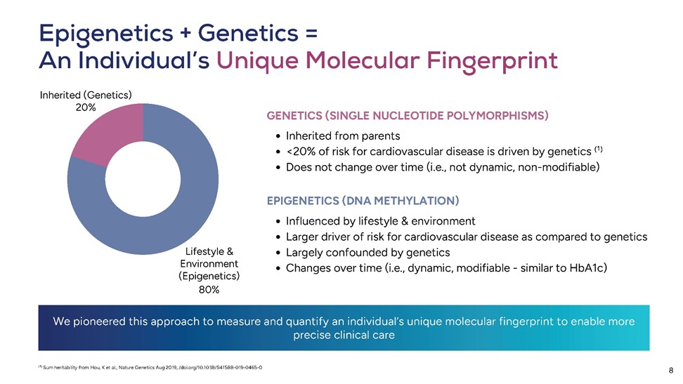 Epigenetics + Genetics = An Individual’s Unique Molecular Fingerprint We pioneered this approach to measure and quantify an individual’s unique molecular fingerprint to enable more precise clinical care EPIGENETICS (DNA METHYLATION) • Influenced by lifestyle & environment • Larger driver of risk for cardiovascular disease as compared to genetics • Largely confounded by genetics • Changes over time (i.e., dynamic, modifiable - similar to HbA1c) GENETICS (SINGLE NUCLEOTIDE POLYMORPHISMS) • Inherited from parents • <20% of risk for cardiovascular disease is driven by genetics ⁽ ¹ ⁾ • Does not change over time (i.e., not dynamic, non - modifiable) ⁽ ¹ ⁾ Sum heritability from Hou, K et al., Nature Genetics Aug 2019, /doi.org/10.1038/S41588 - 019 - 0465 - 0 8
