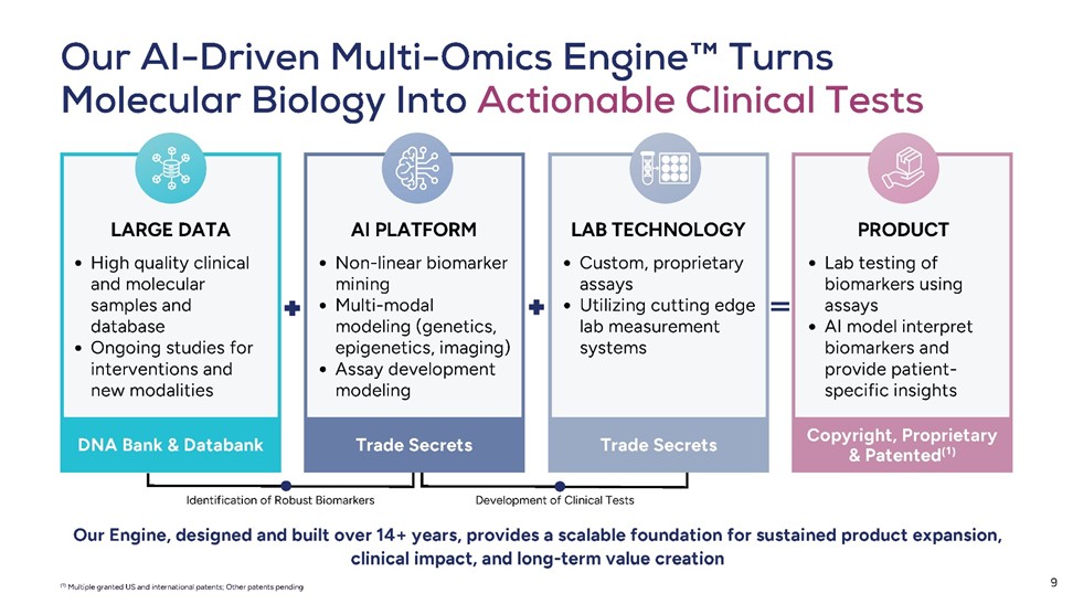 Our AI - Dr iven Multi - Omics Engine Turns Molecular Biology Into Actionable Clinical Tests LARGE DATA • High quality clinical and molecular samples and database • Ongoing studies for interventions and new modalities DNA Bank & Databank Trade Secrets AI PLATFORM • Non - linear biomarker mining • Multi - modal modeling (genetics, epigenetics, imaging) • Assay development modeling • Custom, proprietary assays • Utilizing cutting edge lab measurement systems Trade Secrets LAB TECHNOLOGY • Lab testing of biomarkers using assays • AI model interpret biomarkers and provide patient - specific insights Copyright, Proprietary & Patented ⁽ ¹ ⁾ PRODUCT Identification of Robust Biomarkers Development of Clinical Tests Our Engine, designed and built over 14+ years, provides a scalable foundation for sustained product expansion, clinical impact, and long - term value creation ⁽ ¹ ⁾ Multiple granted US and international patents ; Other patents pending 9