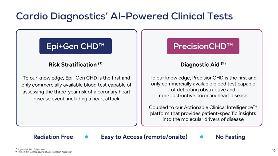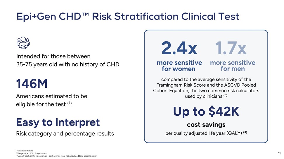 Cardio D iagnostics’ AI - Powered Clinical Tests Risk Stratification ⁽ ¹ ⁾ Diagnostic Aid ⁽ ² ⁾ To our knowledge, Epi+Gen CHD is the first and only commercially available blood test capable of assessing the three - year risk of a coronary heart disease event, including a heart attack To our knowledge, PrecisionCHD is the first and only commercially available blood test capable of detecting obstructive and non - obstructive coronary heart disease Coupled to our Actionable Clinical Intelligence platform that provides patient - specific insights into the molecular drivers of disease No Fasting Radiation Free Easy to Access (remote/onsite) ⁽ ¹ ⁾ Dogan et al., 2021 Epigenomics ⁽ ² ⁾ Philibert R et al., 2023, Journal of American Heart Association 10