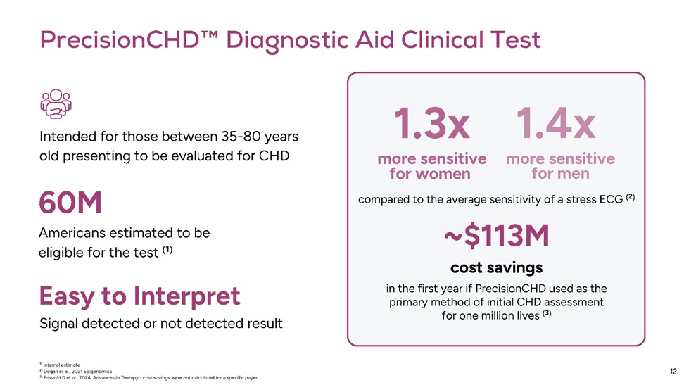 PrecisionCHD D iagnostic Aid Clinical Test cost savings in the first year if PrecisionCHD used as the primary method of initial CHD assessment for one million lives ⁽ ³ ⁾ ~$113M ⁽ ¹ ⁾ Internal estimate ⁽ ² ⁾ Dogan et al., 2021 Epigenomics ⁽ ³ ⁾ Frisvold D et al., 2024, Advances in Therapy - cost savings were not calculated for a specific payer compared to the average sensitivity of a stress ECG ⁽ ² ⁾ 1.3x more sensitive for women 1.4x more sensitive for men Intended for those between 35 - 80 years old presenting to be evaluated for CHD Americans estimated to be eligible for the test ⁽ ¹ ⁾ 60M S ignal detected or not detected result Easy to Interpret 12