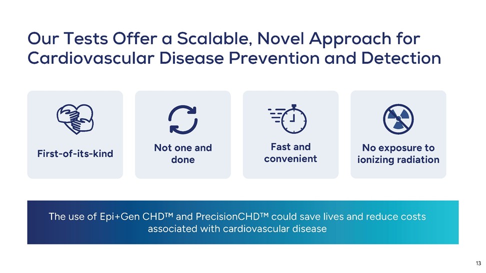 The use of Epi+Gen CHD and PrecisionCHD could save lives and reduce costs associated with cardiovascular disease Our Tests Offer a Scalable, Novel Approach for Cardiovascular Disease Prevention and Detection Not one and done Fast and convenient First - of - its - kind No exposure to ionizing radiation 13