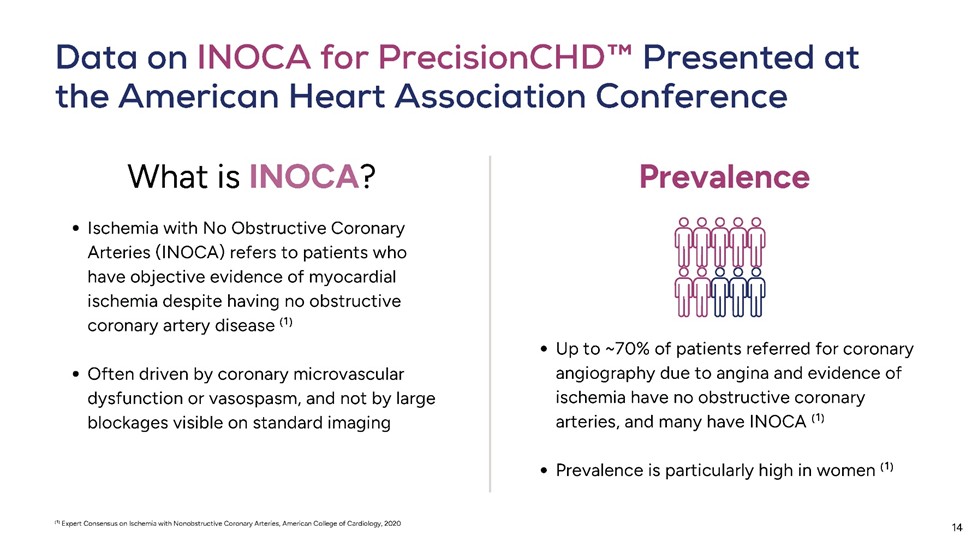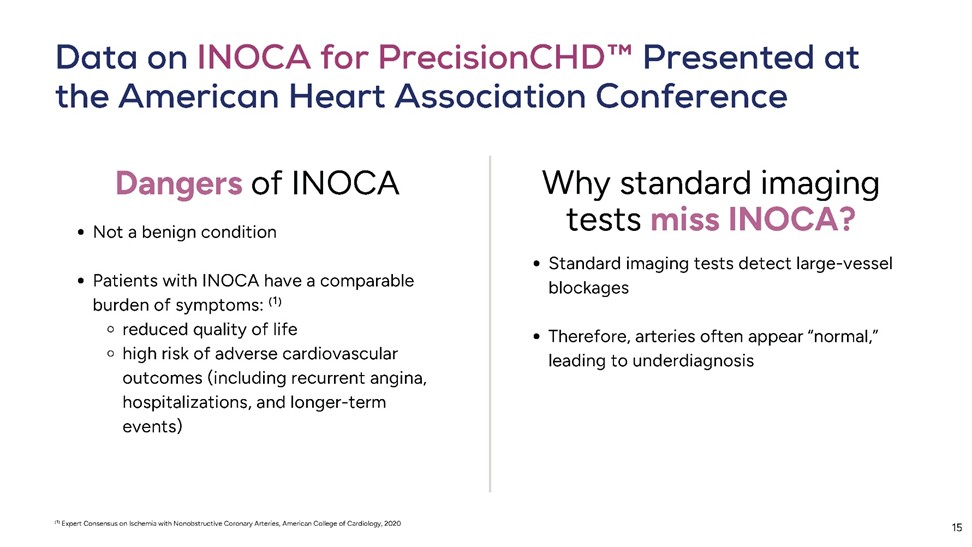 • Up to ~70% of patients referred for coronary angiography due to angina and evidence of ischemia have no obstructive coronary arteries, and many have INOCA ⁽ ¹ ⁾ • Prevalence is particularly high in women ⁽ ¹ ⁾ What is INOCA ? • Ischemia with No Obstructive Coronary Arteries (INOCA) refers to patients who have objective evidence of myocardial ischemia despite having no obstructive coronary artery disease ⁽ ¹ ⁾ • Often driven by coronary microvascular dysfunction or vasospasm, and not by large blockages visible on standard imaging Prevalence ⁽ ¹ ⁾ Expert Consensus on Ischemia with Nonobstructive Coronary Arteries, American College of Cardiology, 2020 Data on INOCA for PrecisionCHD Presented at the American Heart Association Conference 14
