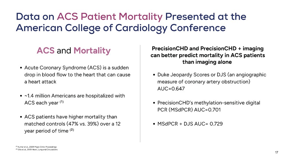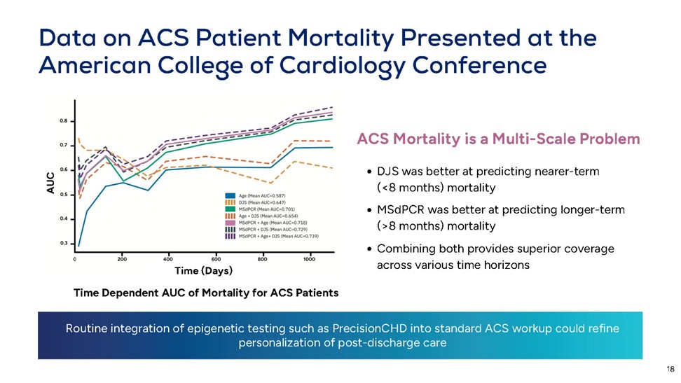 • DJS was better at predicting nearer - term (<8 months) mortality Time Dependent AUC of Mortality for ACS Patients ACS Mortality is a Multi - Scale Problem Data on ACS Patient Mortality Presented at the American College of Cardiology Conference • MSdPCR was better at predicting longer - term (>8 months) mortality • Combining both provides superior coverage across various time horizons Time (Days) AUC Routine integration of epigenetic testing such as PrecisionCHD into standard ACS workup could refine personalization of post - discharge care 18